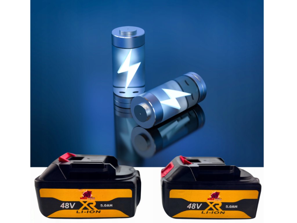 - 2× Li-Ion akumulátor 48 V / 5 Ah s LCD displejom stavu nabitia na dlhšiu prácu bez prerušenia.