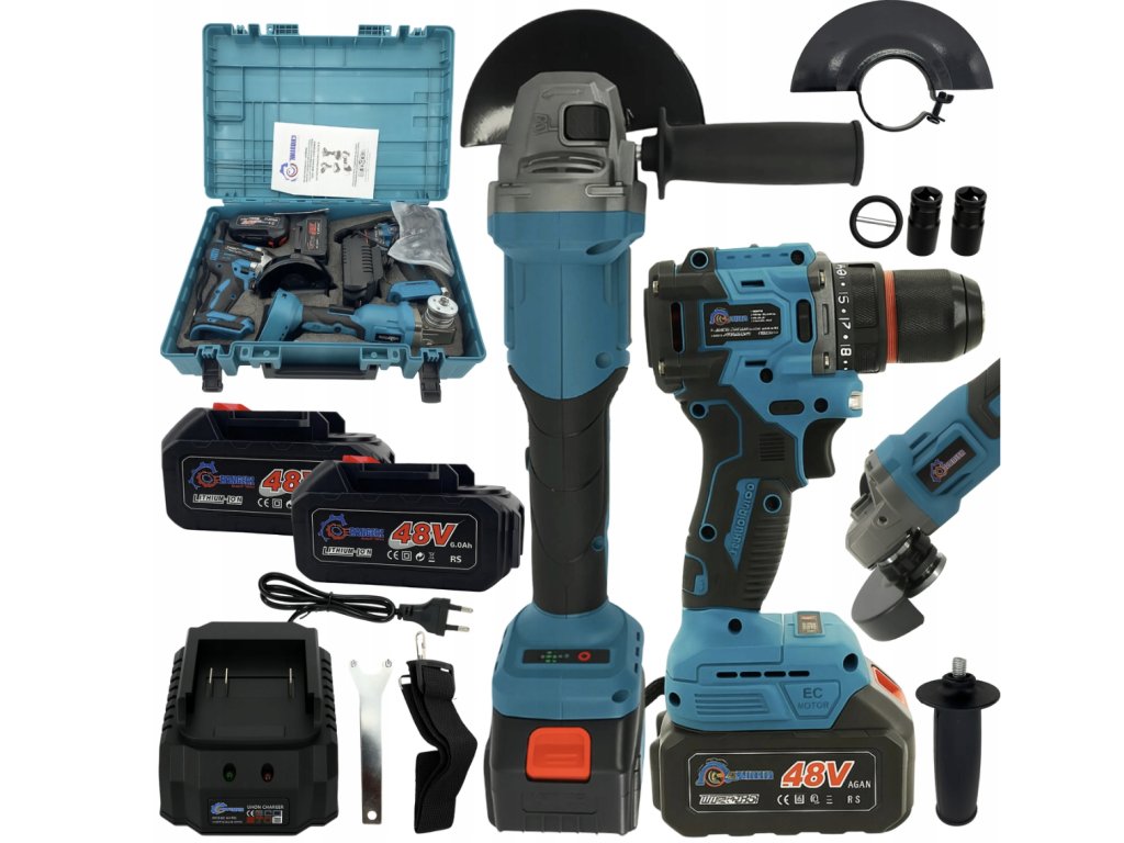 🔧 Akumulátorová súprava 2v1 - uhlová brúska 125 mm + akumulátorová príklepová vŕtačka, 2× Li-Ion 48V 5Ah akumulátor + rýchlonabíjačka