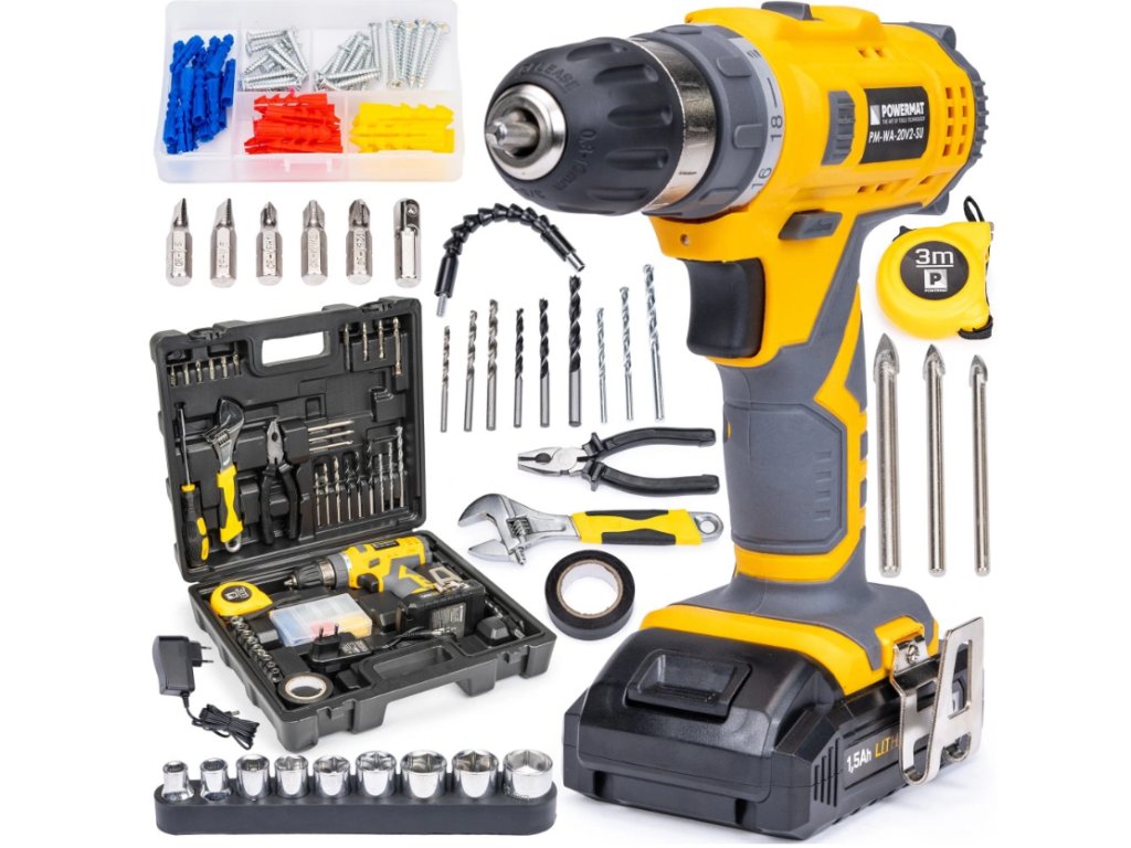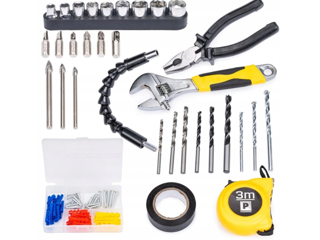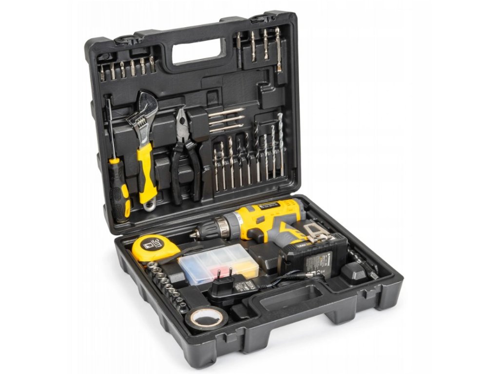 Praktická sada akumulátorových vŕtačiek s náradím na základné práce v domácnosti. Veľkoryso vybavený kufor obsahuje montážne kliešte, meracie pásky, skrutkovacie bity a vrtáky. Vŕtačka dosahuje maximálny krútiaci moment až 35 Nm.