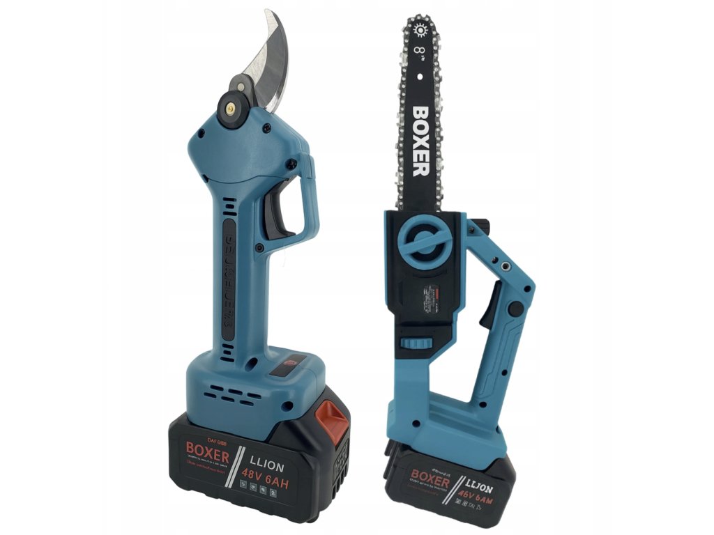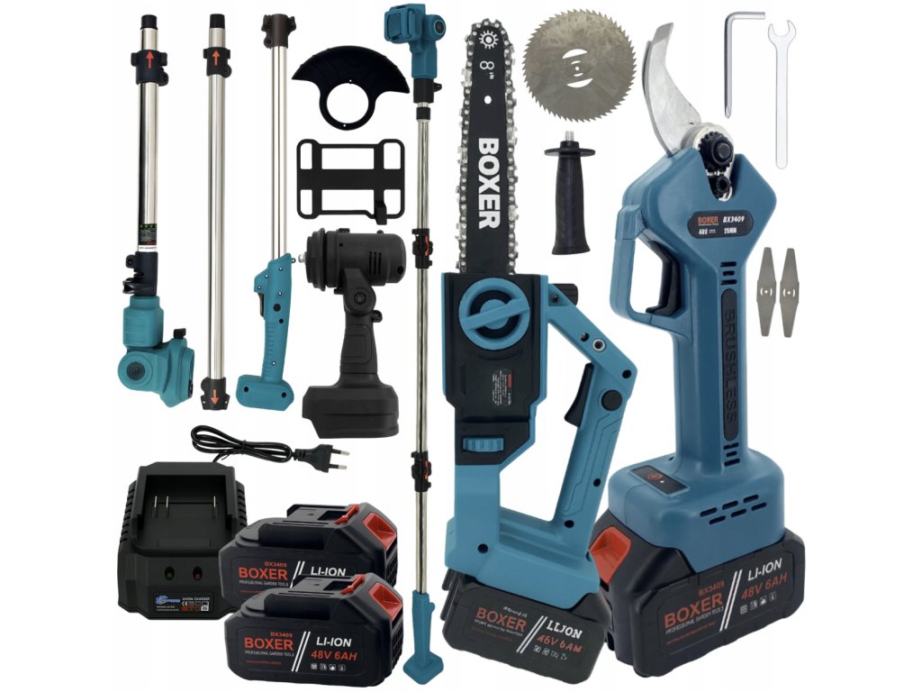 akumulátorová záhradná súprava 3 v 1 BOXER - reťazová píla, nožnice na konáre a prerezávač 48 V