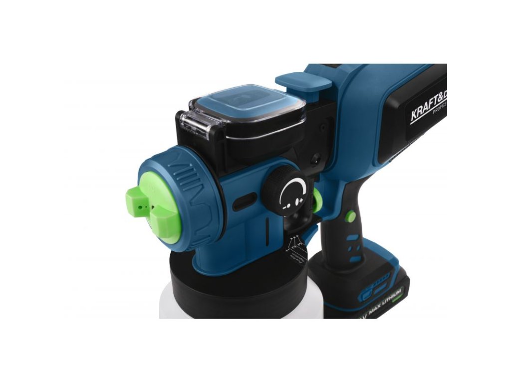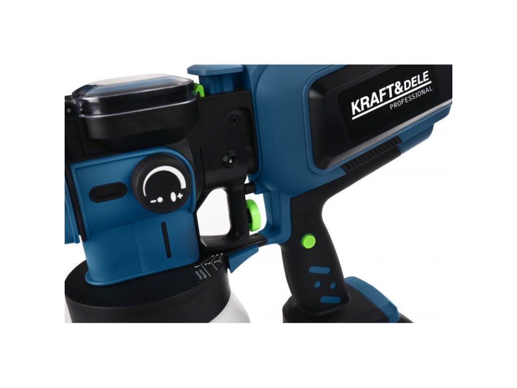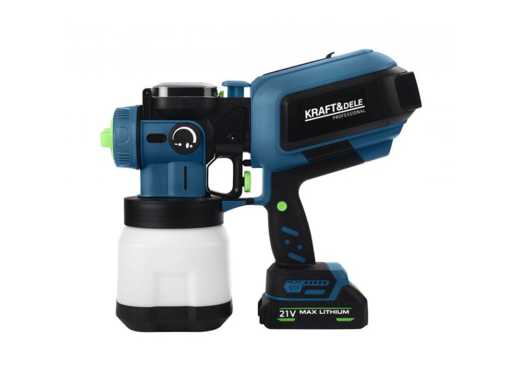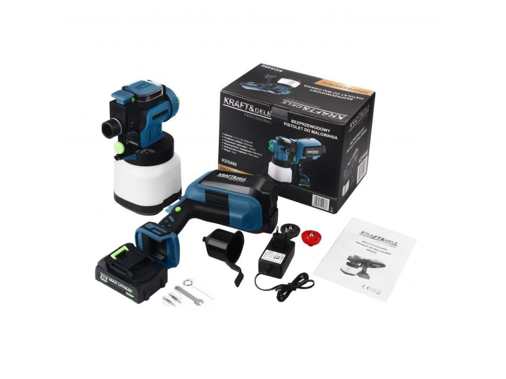 - TECHNICKÝ VÝROBOK Značka: KRAFT&DELE Model: KD5480 Typ nástroja: striekacia pištoľ Výkon: 3000 W Napájanie: 21V / 2500mAh Rozptyl striekania: 200-250mm Objem nádrže: 1200 ml Hmotnosť: 2,68 kg