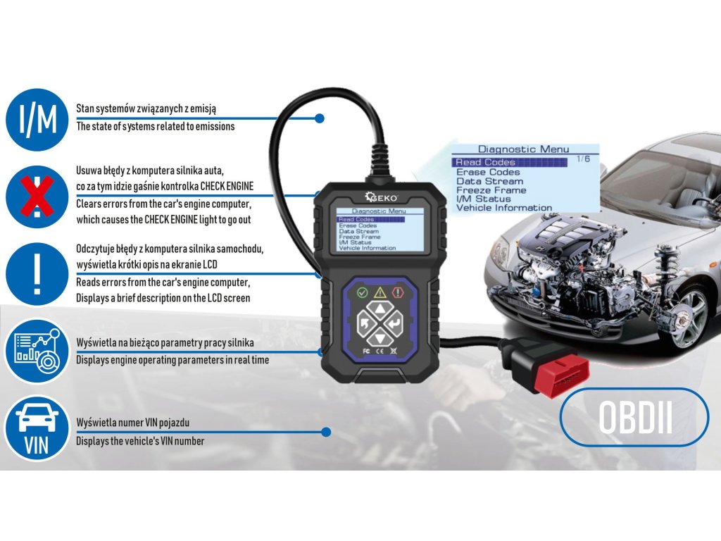 Prístroj sa používa na diagnostiku motorov všetkých vozidiel kompatibilných s OBDII s napätím 12 V a štandardným 16-kolíkovým konektorom.