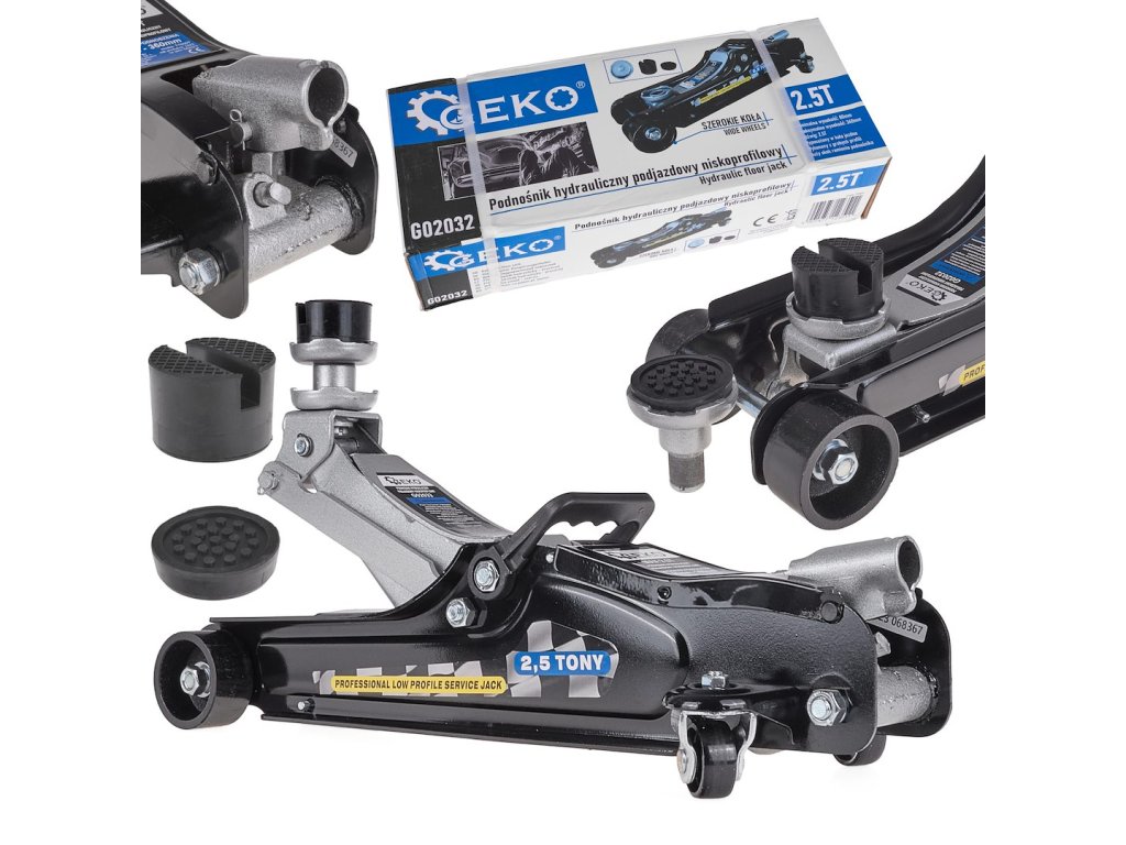 Nízky profil kladkostroj vyrobený z hrubého oceľového plechu na zabezpečenie dostatočnejtuhosť a pevnosť konštrukcie, má vypúšťací ventil integrovaný s bezpečnostným ventilom. Hydraulický žabí kladkostroj je vybavenýmasívnekovové predné kolesá aotočné a ložiskové zadné kolesáktoré zabezpečujú stabilnú prevádzku a vysokú mobilitu. Zdvihák mánízkoprofilový dizajn, vďaka čomu nachádza uplatnenie v autoservisoch, ktoré sa zaoberajú opravami vozidiel sznížené podvozky, športové a tuningové vozidlá.