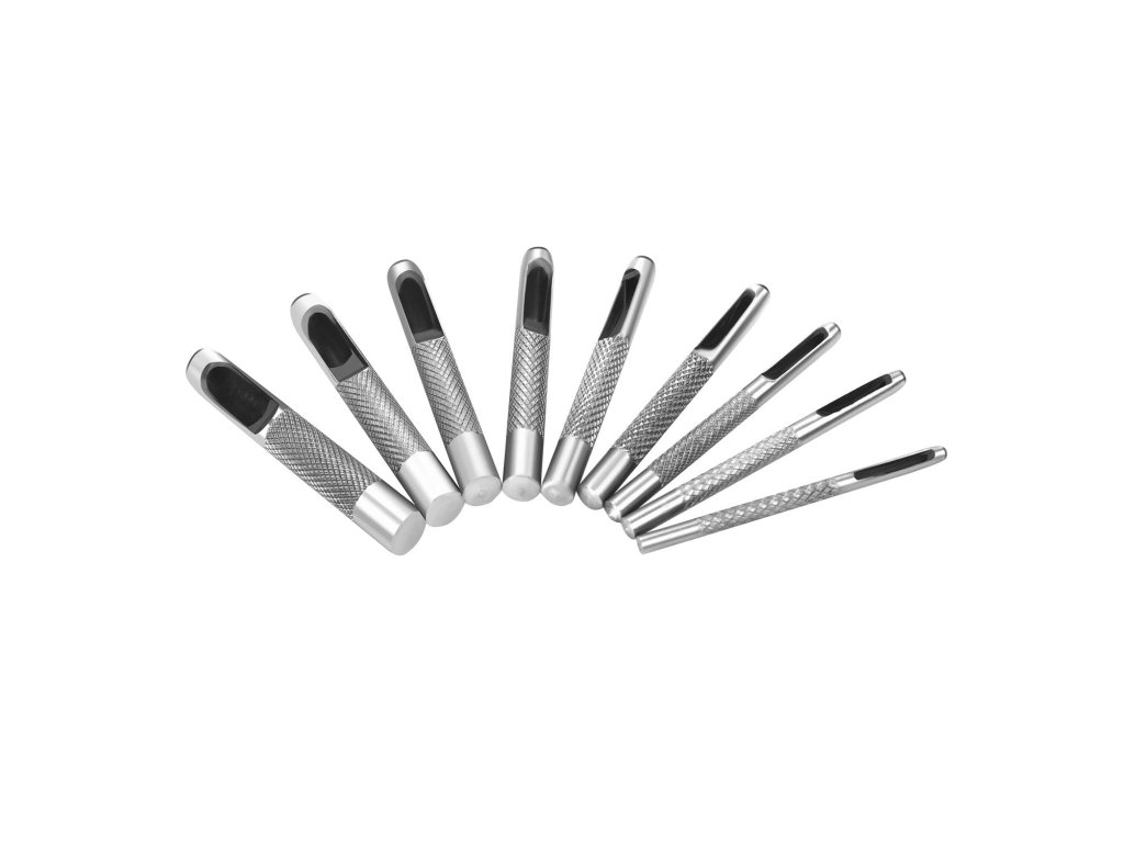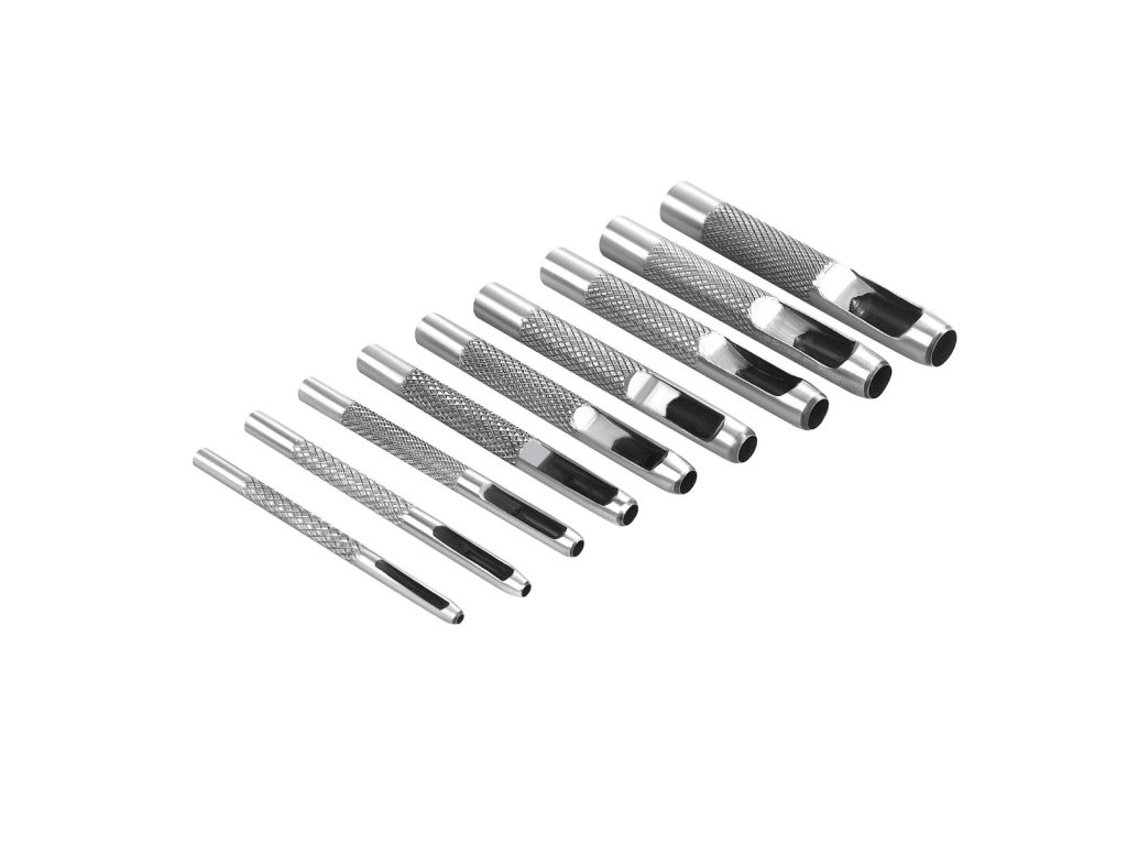Vyskúšajte našu sadu lisovacích dierovačov, ktorá je snom každého majstra a profesionála! Obsahuje 9 rôznych priemerov, vyrobených zkvalitná uhlíková oceľktoré vám pomôžu vytvoriť presné otvory do kože, plastu alebo gumy. Na dosiahnutie najlepších výsledkov používajte dierovač podpravý uhol. Ideálne na šitie alebo remeselné práce. Srdcom tejto sady jepracovná časťktorý je pieskovaný a leštený pre ľahšiu a presnejšiu prácu.