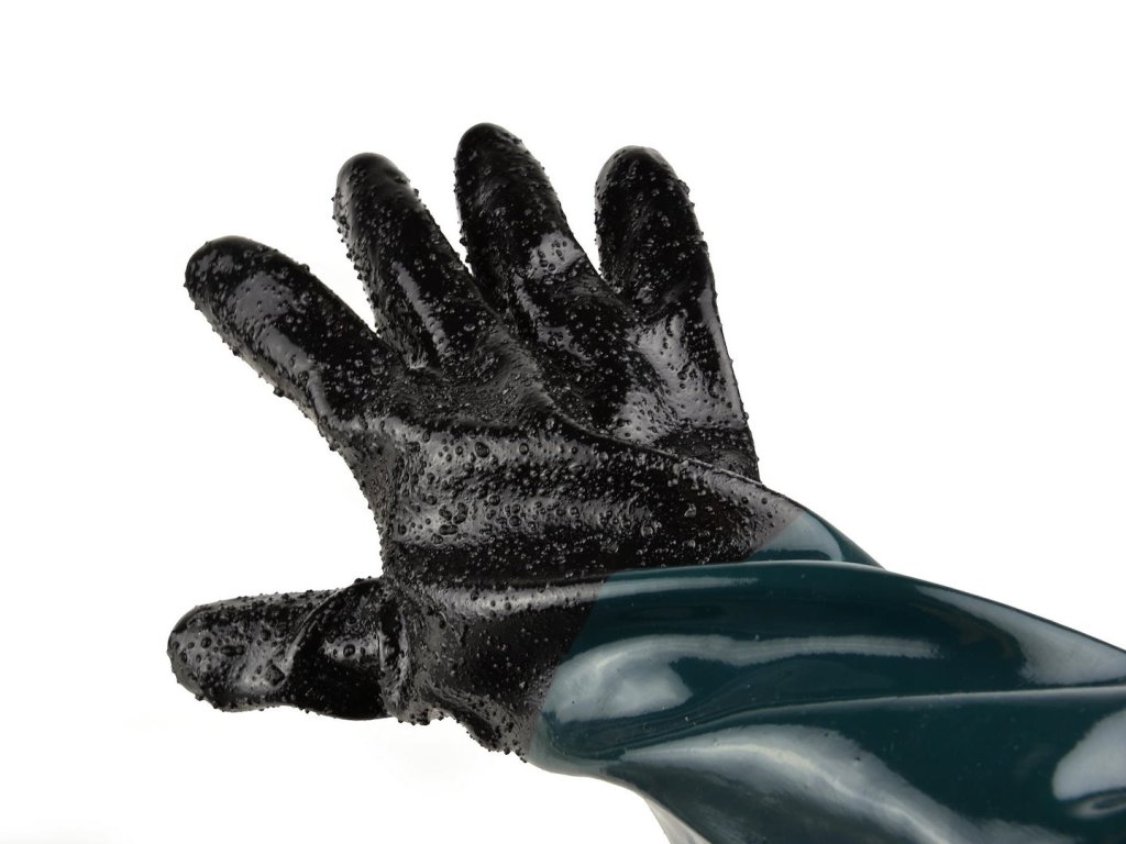 Rukavice na pieskovanie sú vyrobené z gumy, vinylu a skai. Pracovná časť s drsnou štruktúrou umožňuje bezpečnejšie uchopenie obrobku.