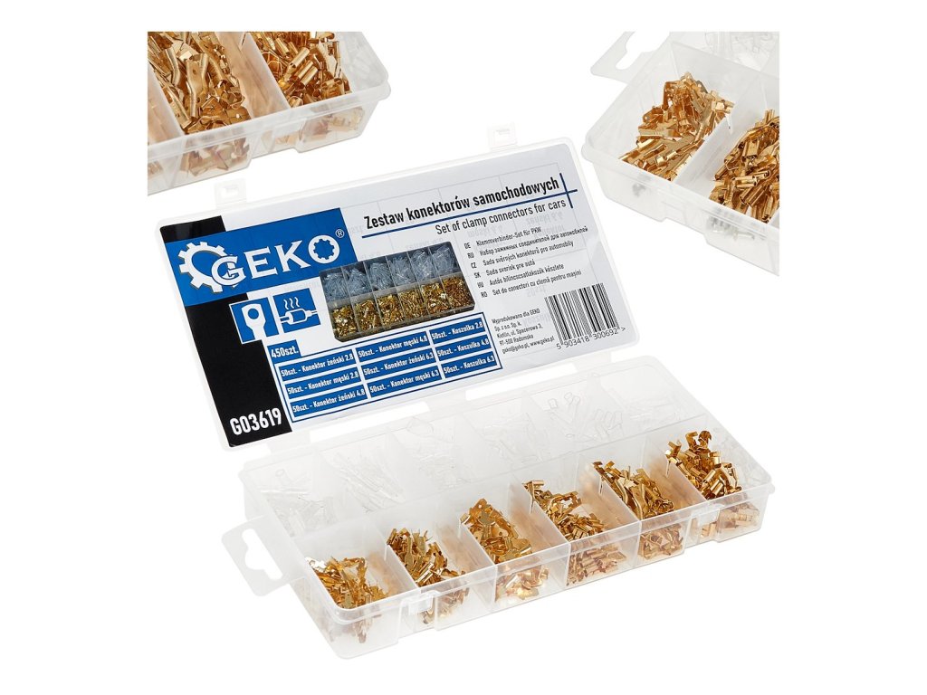 Súprava450 automobilových konektorov je ideálnym riešením na opravu, modernizáciu a vykonávanie elektrických inštalácií v automobiloch, motocykloch, štvorkolkách, lodiach a priemyselných strojoch. Súprava obsahuje všetky najpoužívanejšie veľkosti konektorov samcov a samíc spolu s príslušnými ochrannými krytkami.