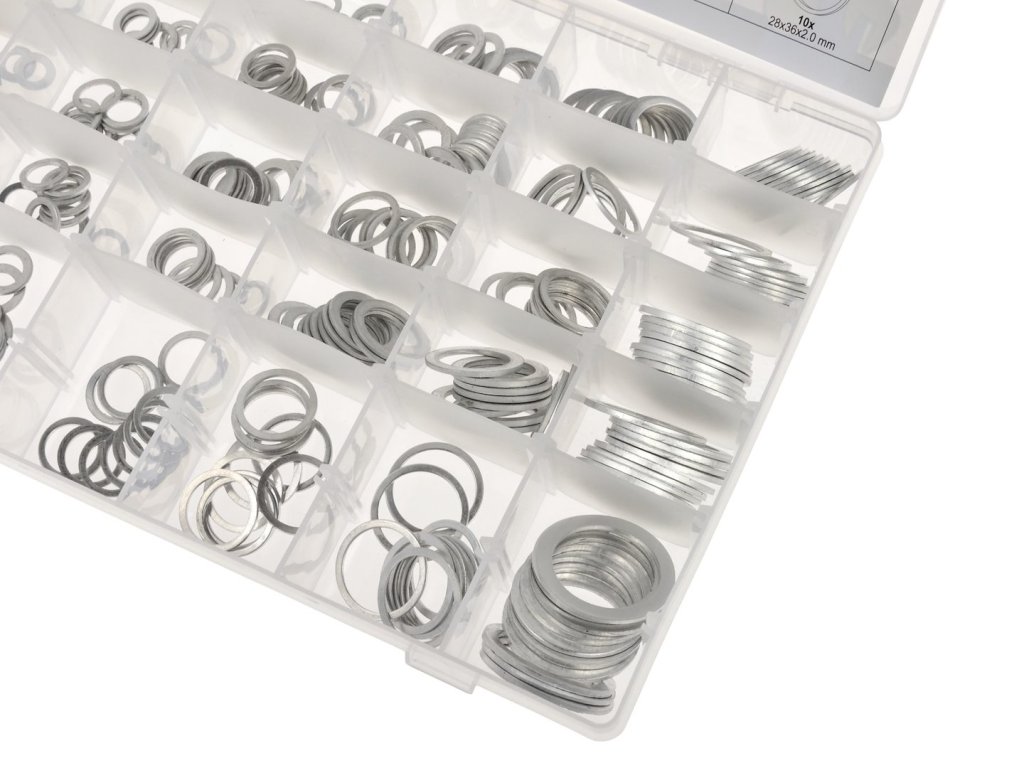 Súprava 300 hliníkových podložiek v 30 rôznych veľkostiach.