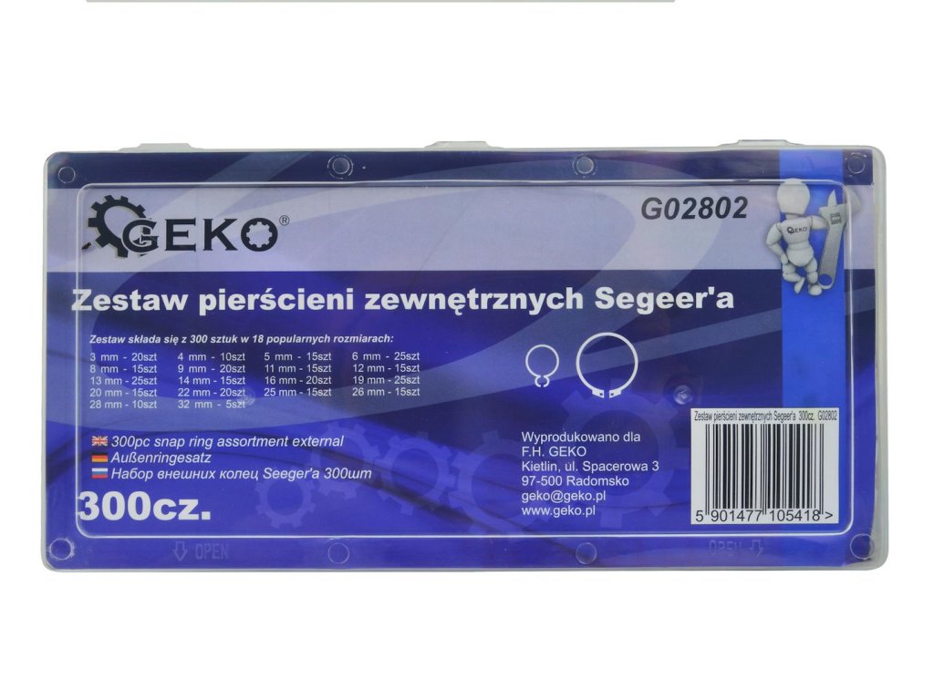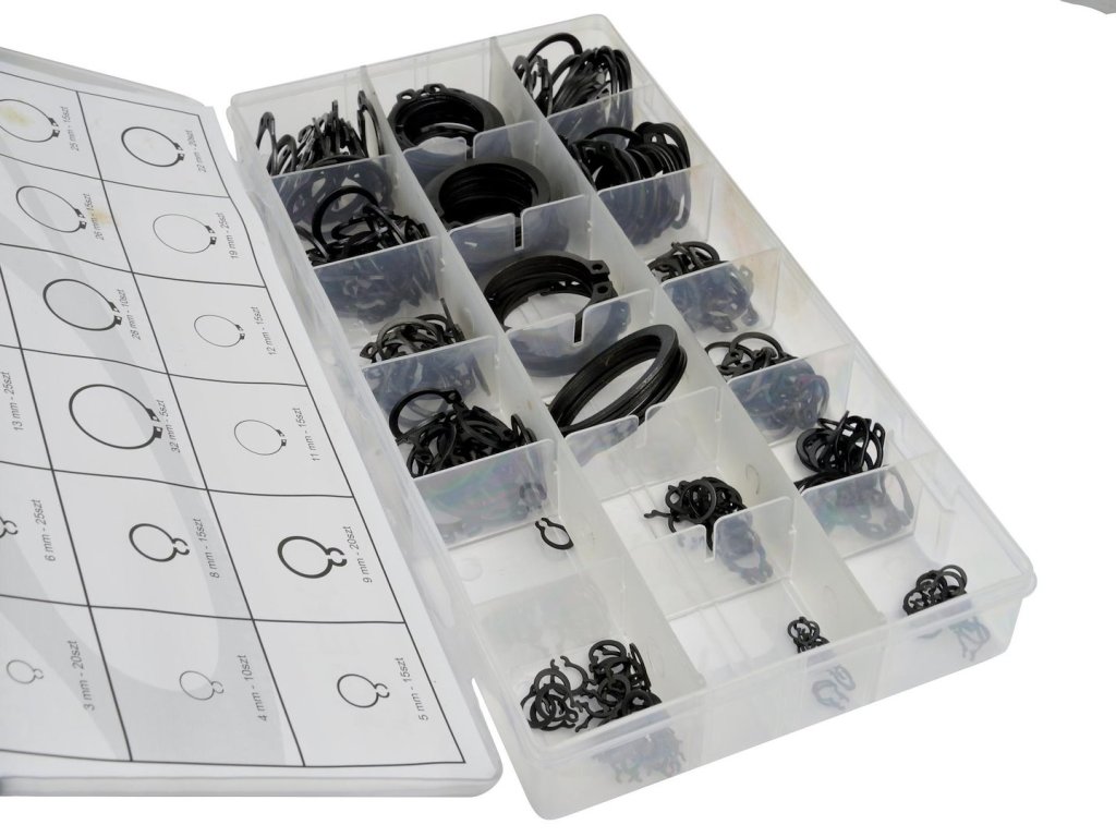 Sada 300 vonkajších krúžkov Seeger vo veľkostiach 3-32 mm.