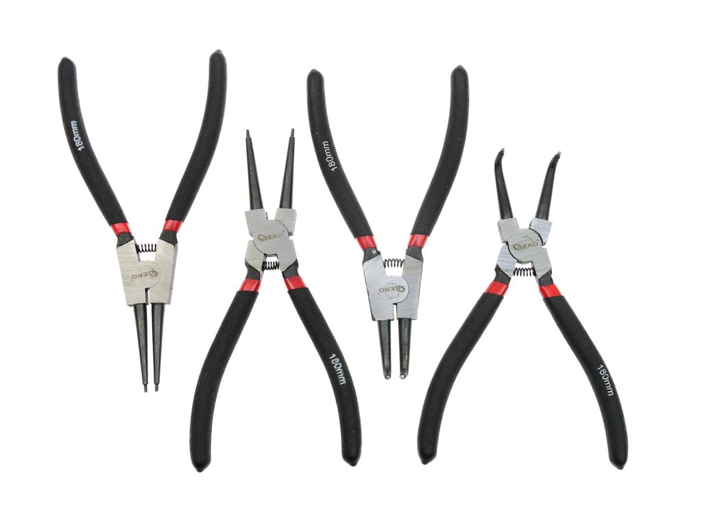 Sada klieštíumožňuje montáž a demontáž vnútorných (rozšíriteľná vo vnútri puzdra) avonkajších (svorka na vonkajšej strane hriadeľa) poistné krúžky. Súprava obsahuje 4 typy klieští.