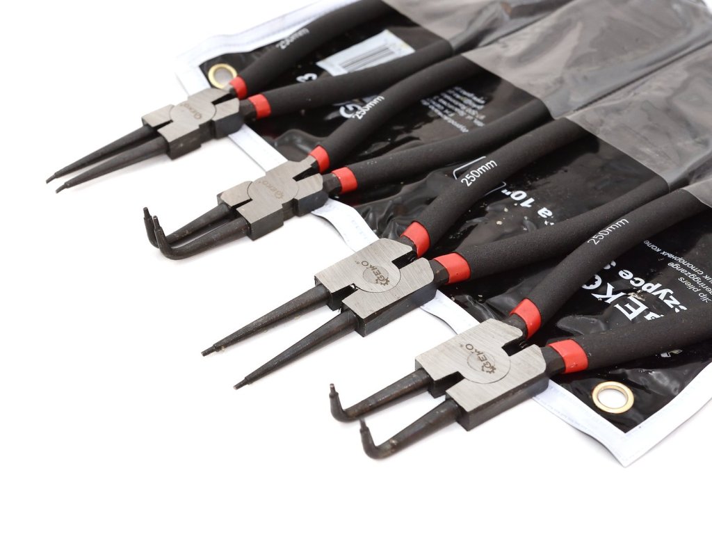 Sada klieštíumožňuje montáž a demontáž vnútorných (rozšíriteľná vo vnútri puzdra) avonkajších (svorka na vonkajšej strane hriadeľa) poistné krúžky. Súprava obsahuje 4 typy klieští.