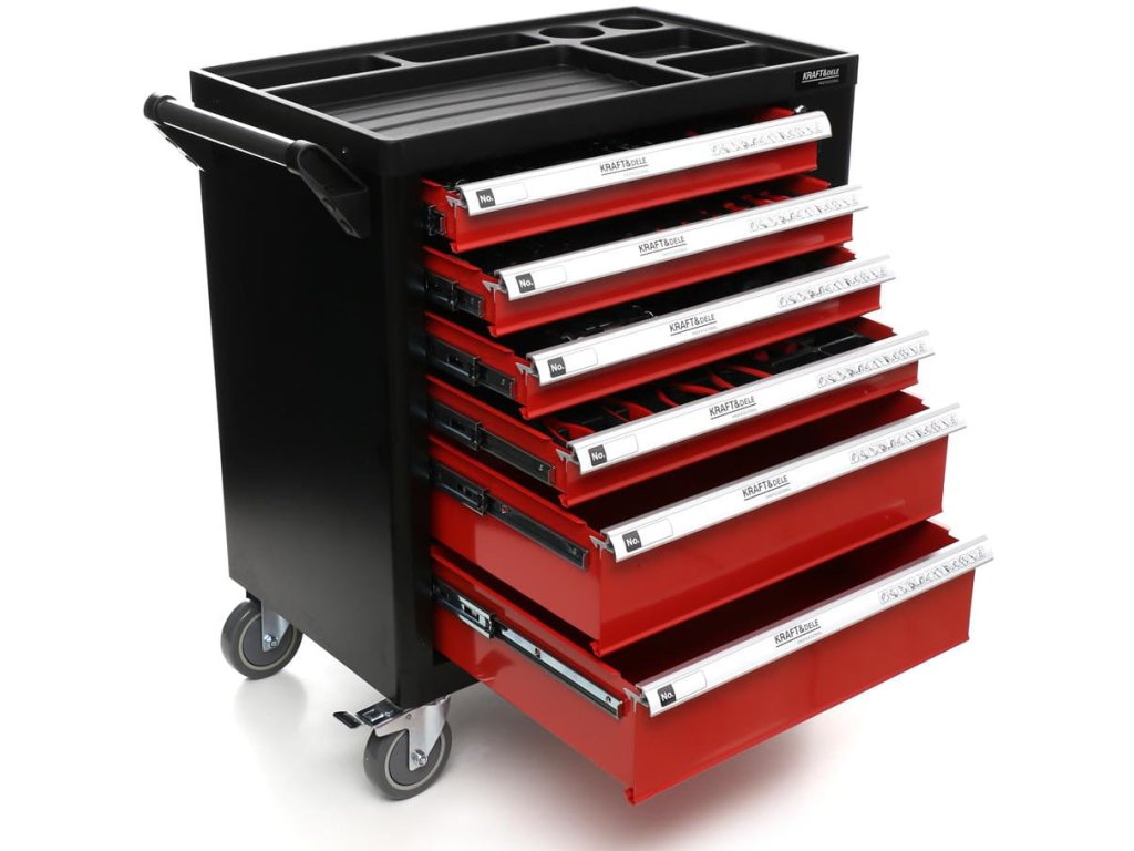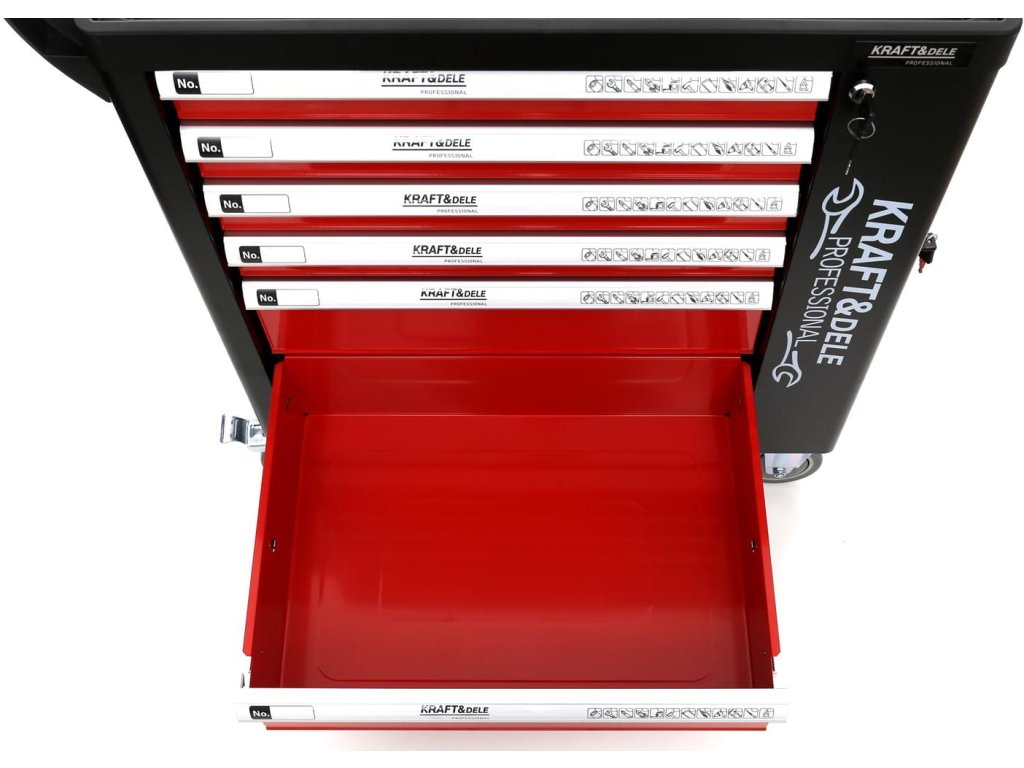 - Dokonalá organizácia: prvé tri zásuvky obsahujú sady račňových kľúčov, skrutkovačov, kľúčov a kladív. Štvrtá zásuvka obsahuje kliešte a elektrické konektory, zatiaľ čo posledné dve zásuvky sú voľné pre veľké náradie.