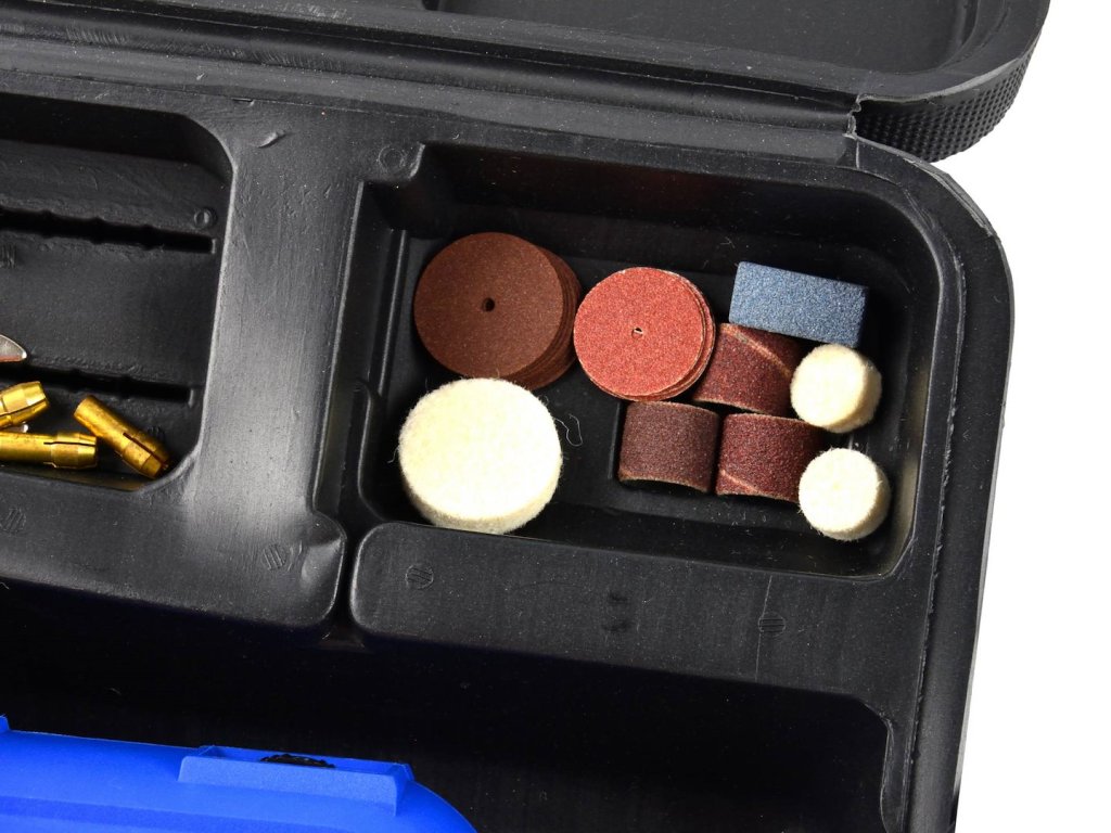 Multifunkčný mlynček so sadou 40 kusov príslušenstva. Náradie je vybavené 170 W elektromotorom s plynulou reguláciou otáčok od 15 000 do 35 000 ot.