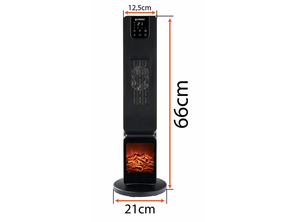 elektrický radiátor, keramický radiátor, plameňový efekt, POWERMAT PM-GKL-3500DLK, ohrev 2500 W, stĺpový radiátor, radiátor s diaľkovým ovládaním