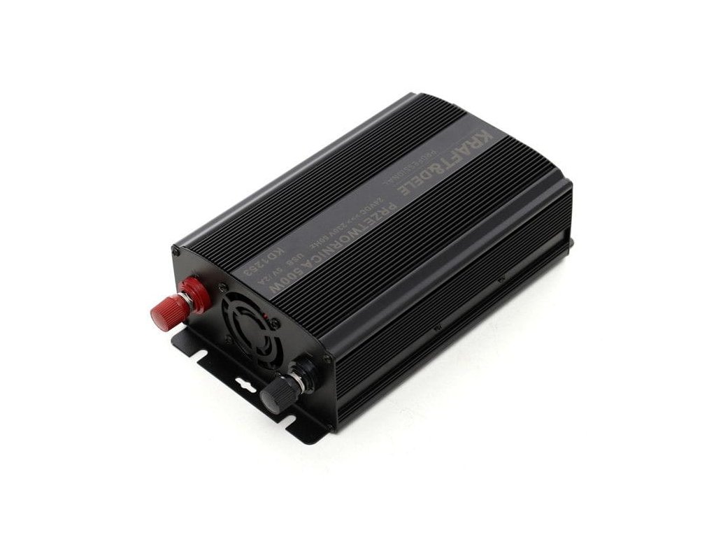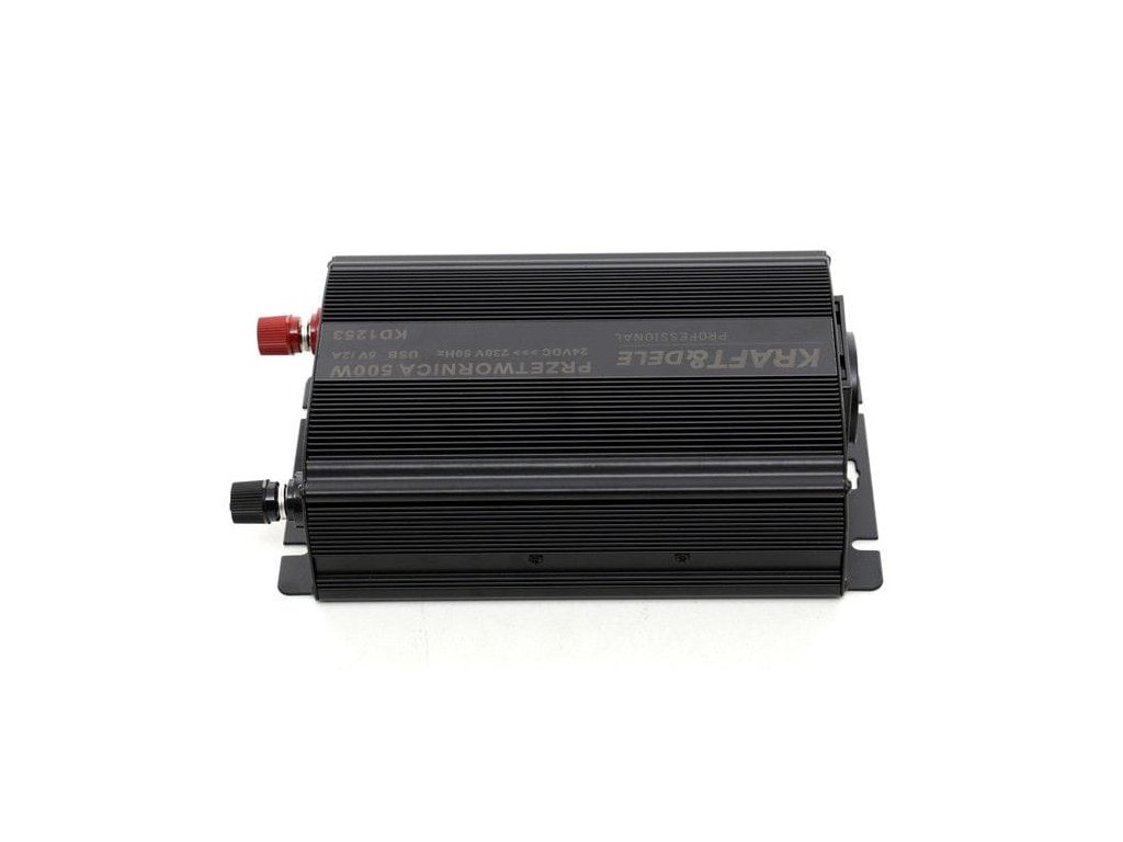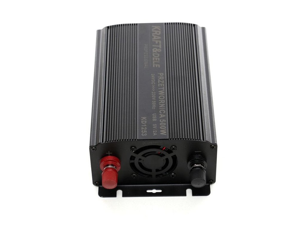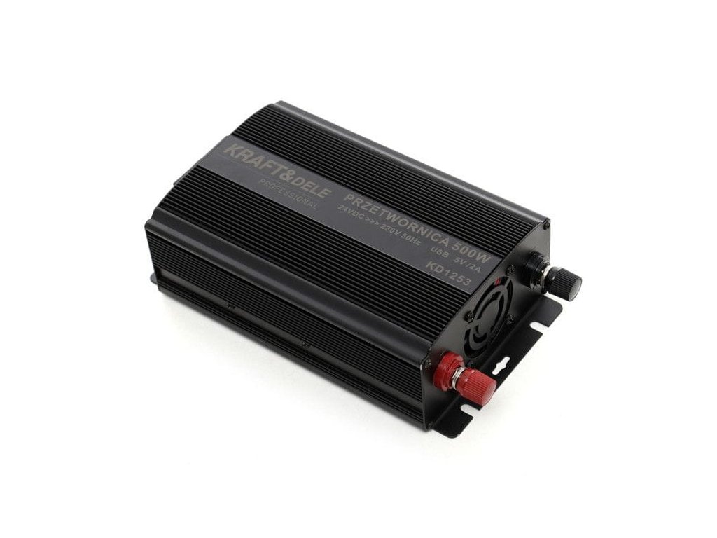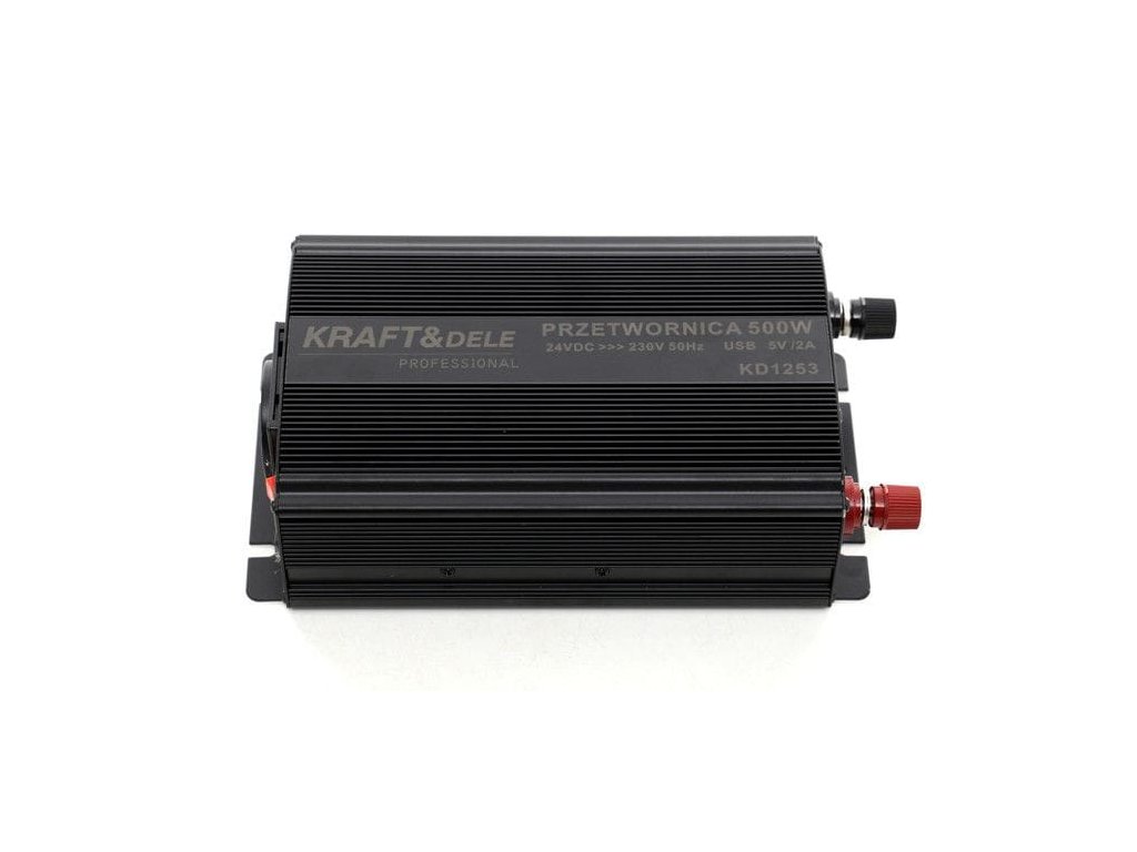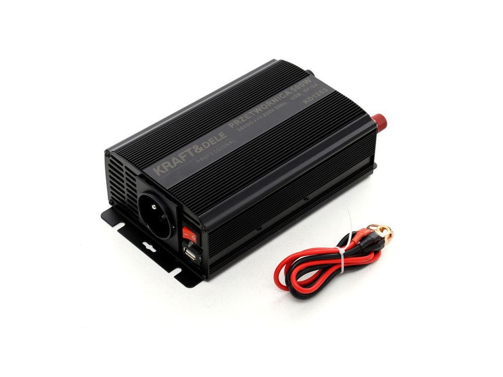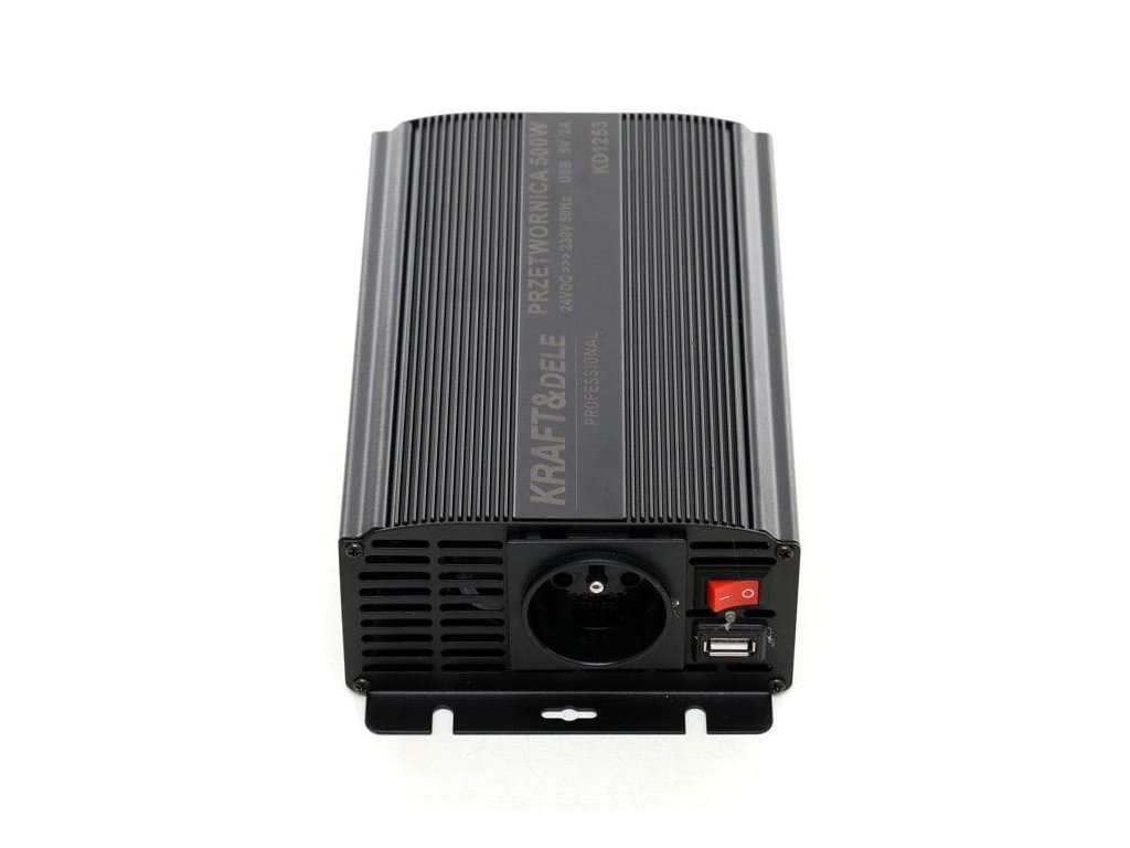 - TECHNICKÝ VÝROBOK Značka: KRAFT&DELE Model: KD1250-12V, KD1251-24V Typ zariadenia: DC/AC menič Trvalý výkon: 350 W Pulzný výkon: 700 W Účinnosť: 85 % Prúd naprázdno: < 0,6A Výstupné napätie: 230 V Výstup USB: 5 V, 2 A SADA OBSAHUJE
