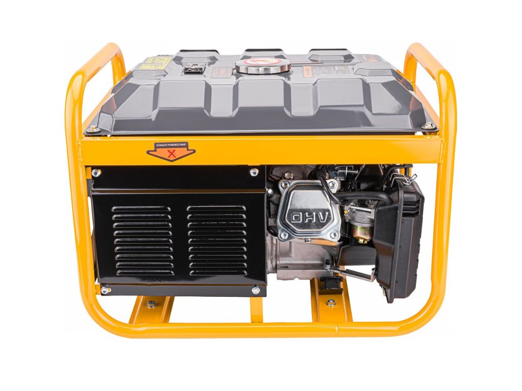 Generátor je vybavený robustným rámom, ktorý chráni motor a elektrické komponenty pred nárazmi a znečistením. Gumové tlmiče nárazov minimalizujú prenos vibrácií do krytu, čo znižuje hluk a zlepšuje stabilitu stroja počas prevádzky. Palivová nádrž má priehľadný indikátor hladiny, ktorý umožňuje jednoduchú kontrolu bez otvorenia krytu.