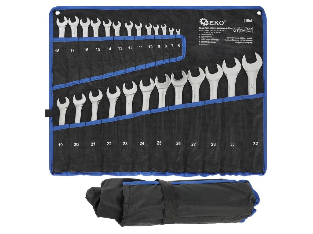 Sada 25 leštených kľúčov s plochým a okrúhlym koncom. Kľúče sú vyrobené z chróm-vanádiovej ocele (CrV). Kľúče sú uložené v odolnom puzdre so suchým zipsom a možnosťou zavesenia na stenu.