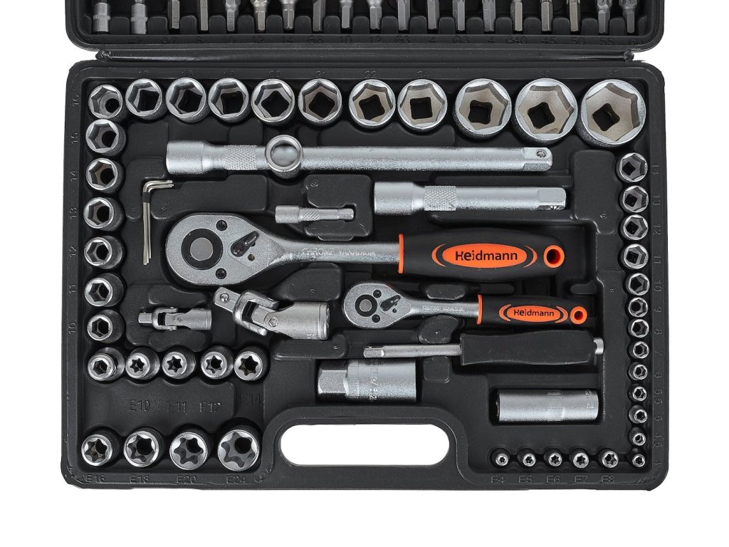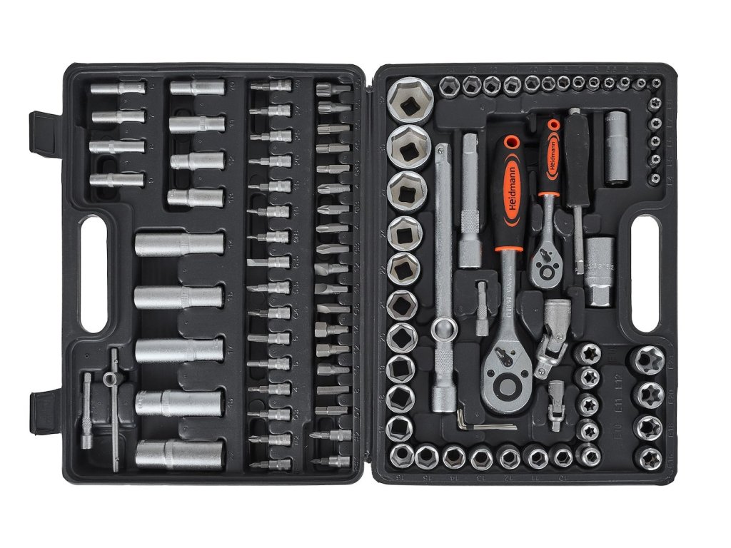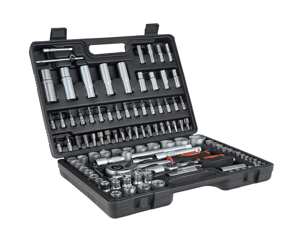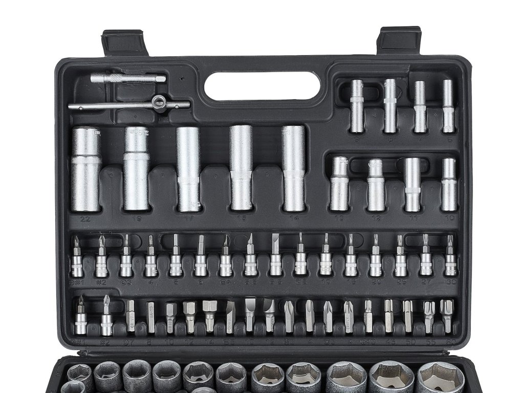 Sada 108 nástrčných kľúčov a bitov. Všetky nástroje sú vyrobené z chróm-vanádiovej ocele.