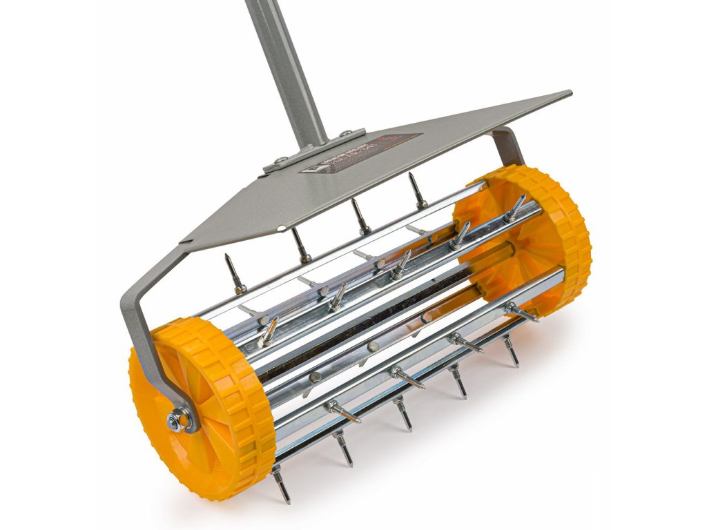šírka 34 cm ľahké kolesá 27 oceľových kolíkov ideálne na údržbu trávnika