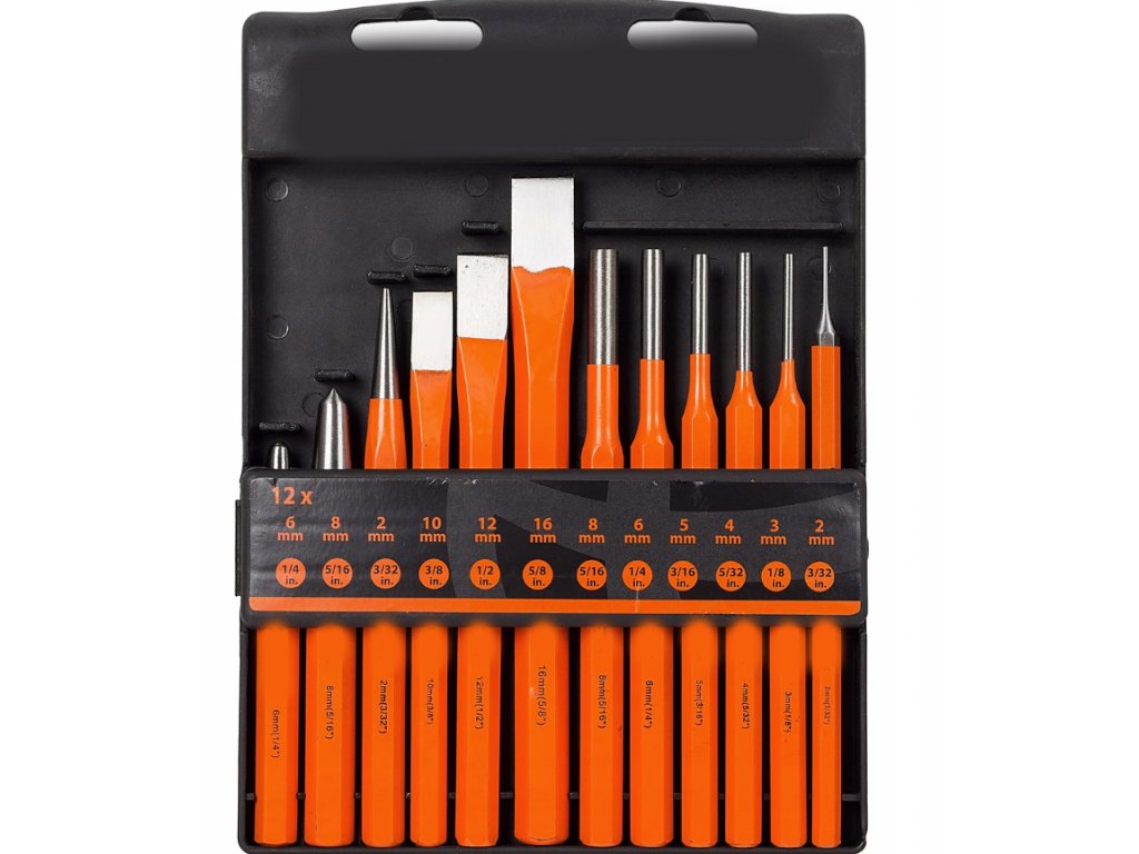 Sada stredových razidiel, dierovačov a sekáčov, kompletná: 2 x dierovač, 6 x sekáč, 1 x valcový dierovač, 3 x kužeľový dierovač.