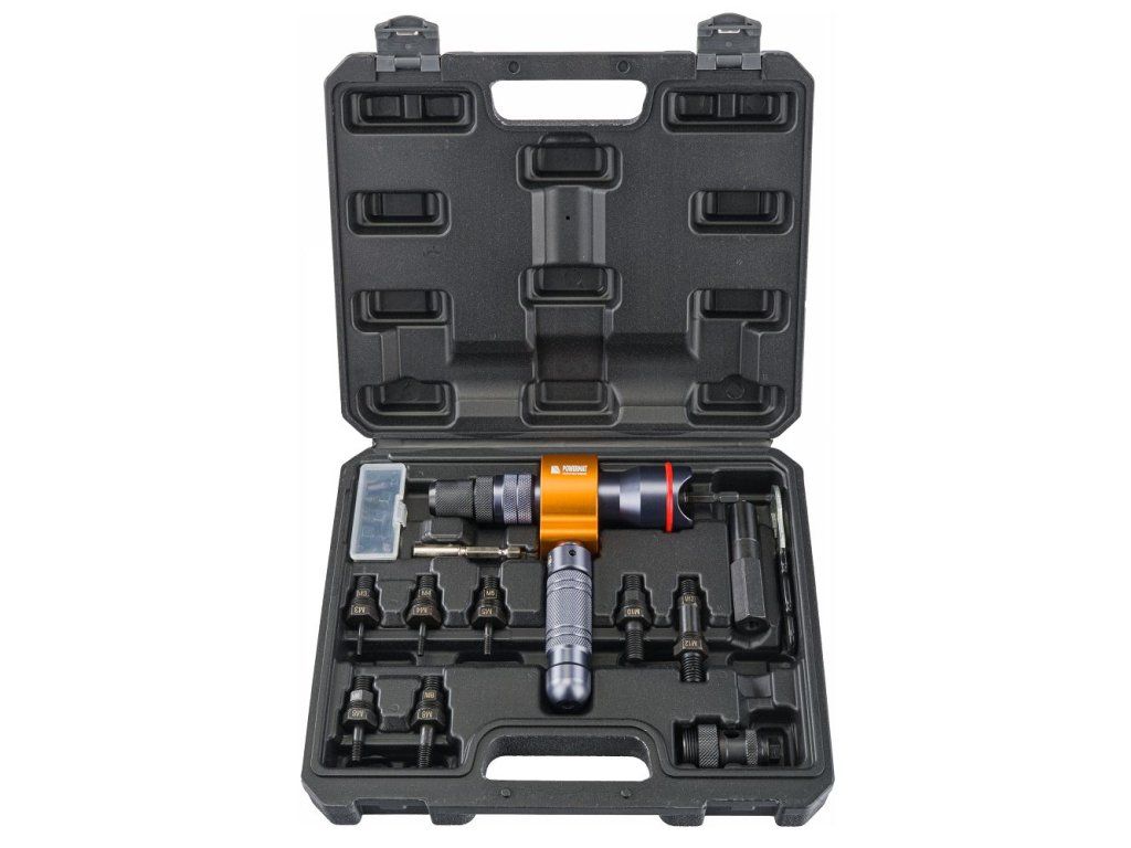 Adaptér je vhodný pro nýtovací matice M3 až M12 a nýty o průměru 2,4 až 6,4 mm. Je kompatibilní s různými materiály jako je hliník, měď, ocel a nerezová ocel.