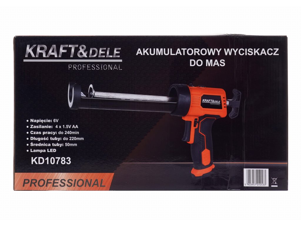 - TECHNICKÝ VÝROBOK Značka: KRAFT&DELE Model: KD10783 Typ nástroja: extraktor hmoty Napätie: 6 V Napájanie: 4 x 1,5 V AA Pracovný čas: do 240 min Rozmery trubice: dĺžka. : do 220 mm priemer: 50 mm Hmotnosť: 1,28 kg