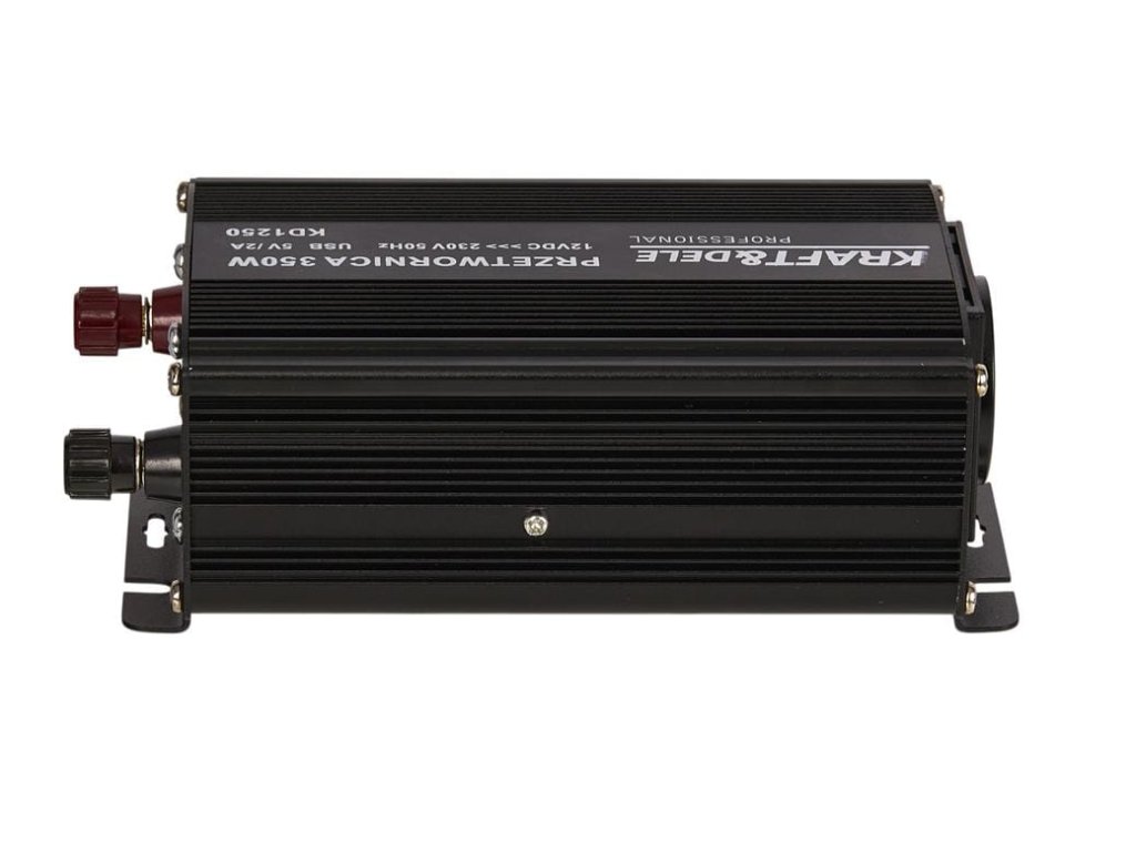 - TECHNICKÝ VÝROBOK Značka: KRAFT&DELE Model: KD1250-12V Typ zariadenia: DC/AC menič Trvalý výkon: 350 W Pulzný výkon: 700 W Účinnosť: 85 % Prúd naprázdno: < 0,6A Výstupný prúd: 230 V Výstup USB: 5 V, 2 A SADA OBSAHUJE