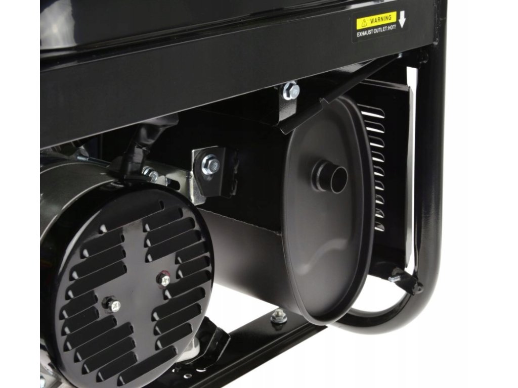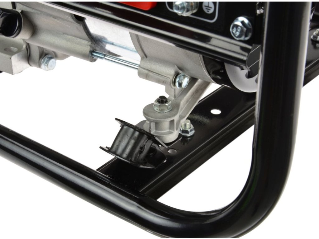 Generátor je vybavený nožičkami s gumovými nožičkami, ktoré znižujú vibrácie, a rámom s rukoväťami na jednoduché prenášanie.