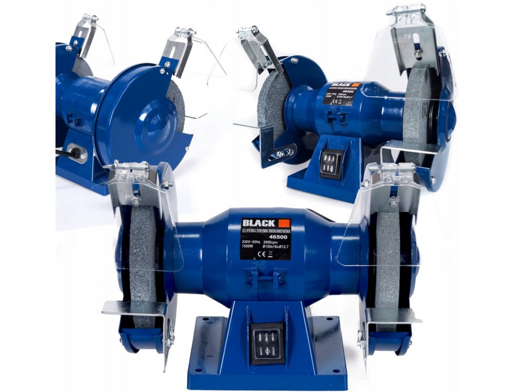 - Má dva brúsne kotúče (na hrubé a jemné brúsenie), robustnú konštrukciu, ochranné kryty a stabilnú základňu