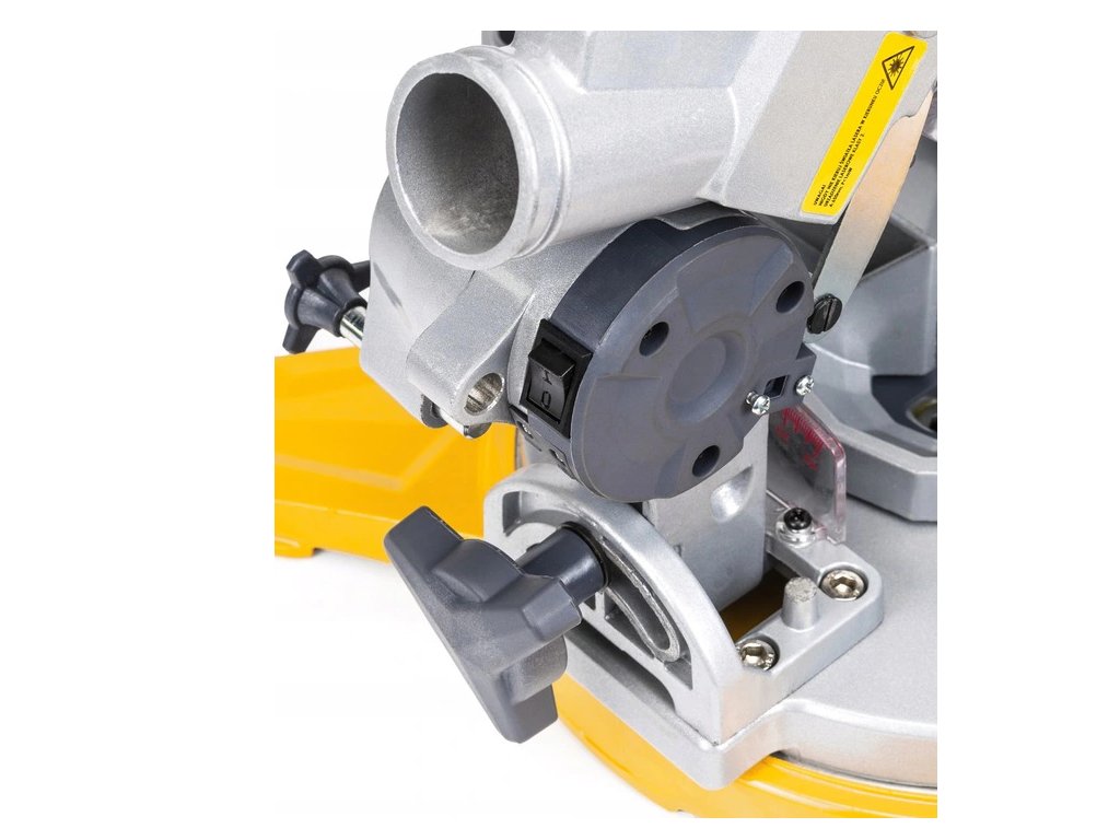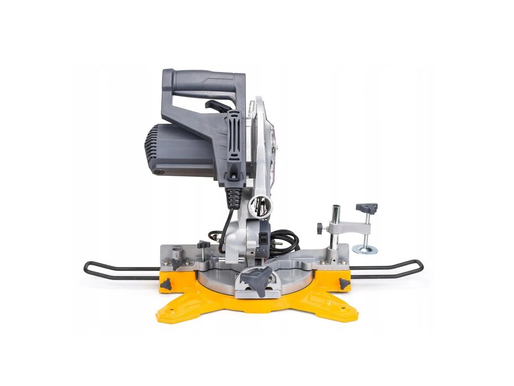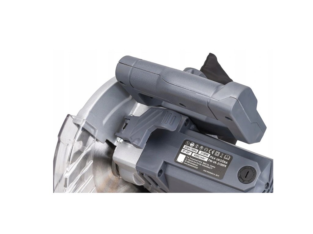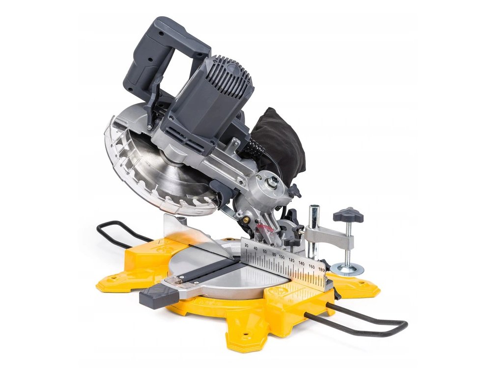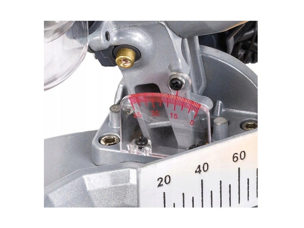 Dvojité šikmé rezy sú možné vďaka naklonenej a otočnej hlave. Píla je vybavená odolným motorom s maximálnym výkonom 2100 W s vymeniteľnými kefami. Laserové vedenie inštalované v zariadení zvyšuje komfort a presnosť práce s materiálom. Napájanie zabezpečujú dve batérie LR44. Otočný stôl s nastavením uhla a naklápacím kotúčom s rozsahom nastavenia 0 - 45 stupňov. Vodiace zariadenie a zverák na bezpečnú a čistú prácu v dreve, ale aj v hliníku a plastoch pomocou špeciálneho noža.