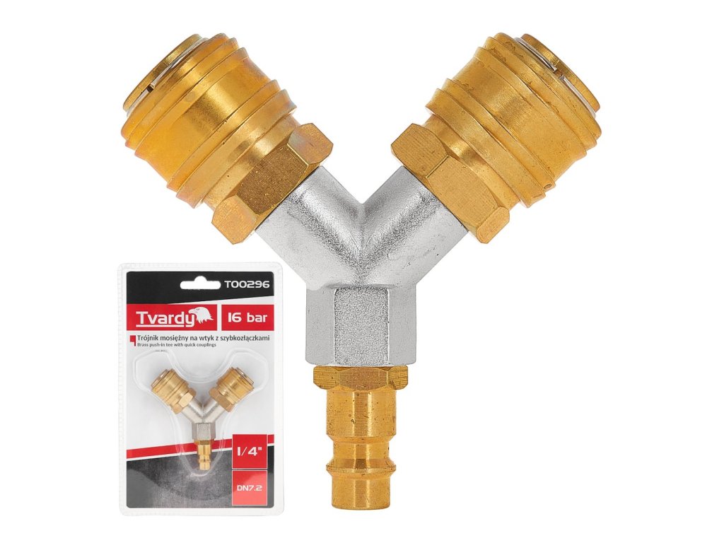 Robustný mosadzný T-kus s 1/4" konektorom vybavenédve pneumatické rýchlospojkyurčené na rozvod vzduchu v pneumatických zariadeniach. Vďaka použitiu kvalitnej mosadze a precíznemu spracovaniu zaručuje tento prvok dlhú životnosť, tesnosť a bezpečnú prevádzku v širokom rozsahu teplôt.