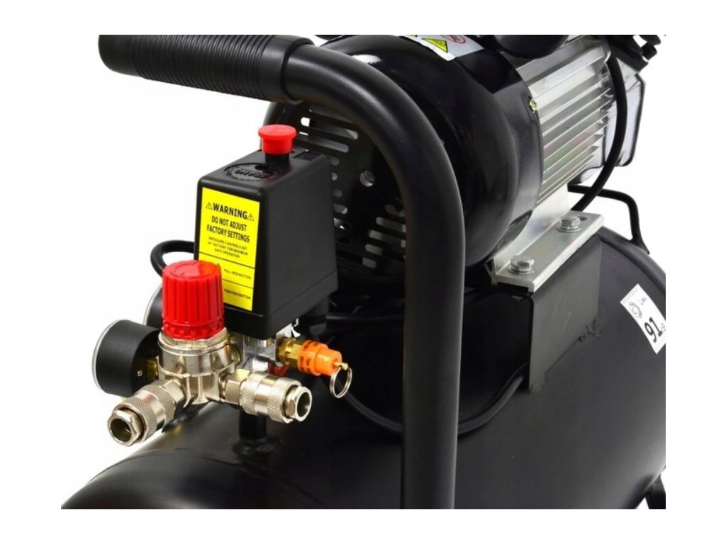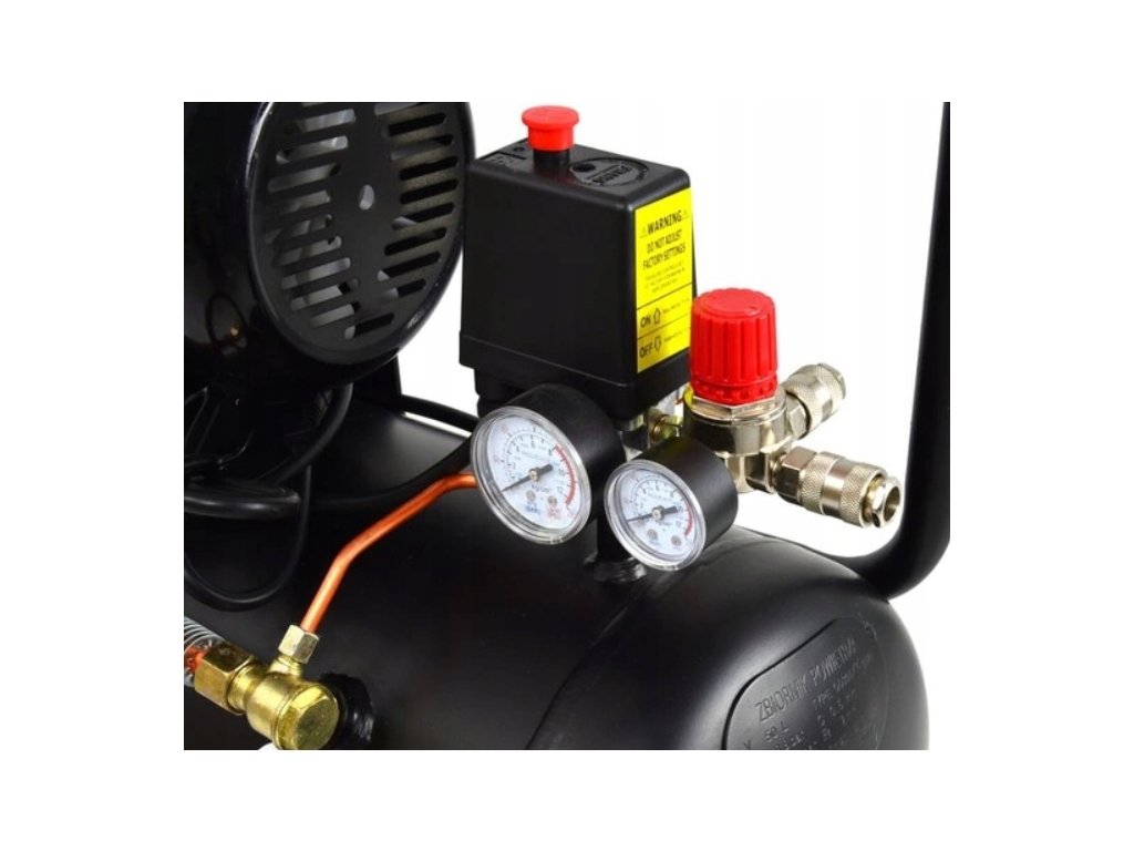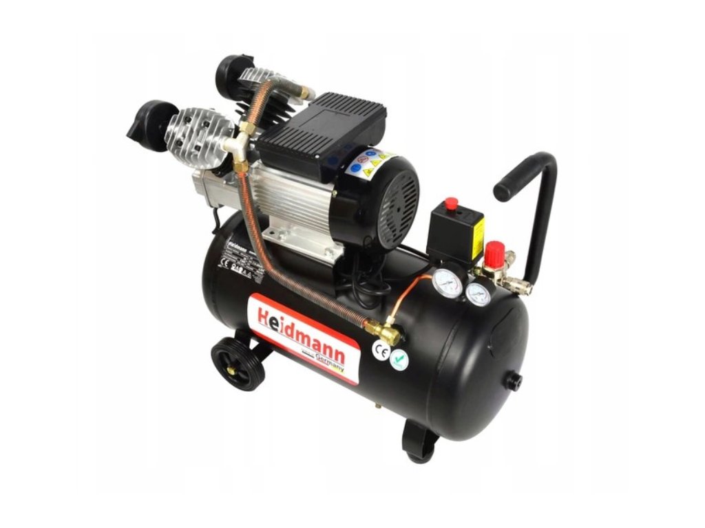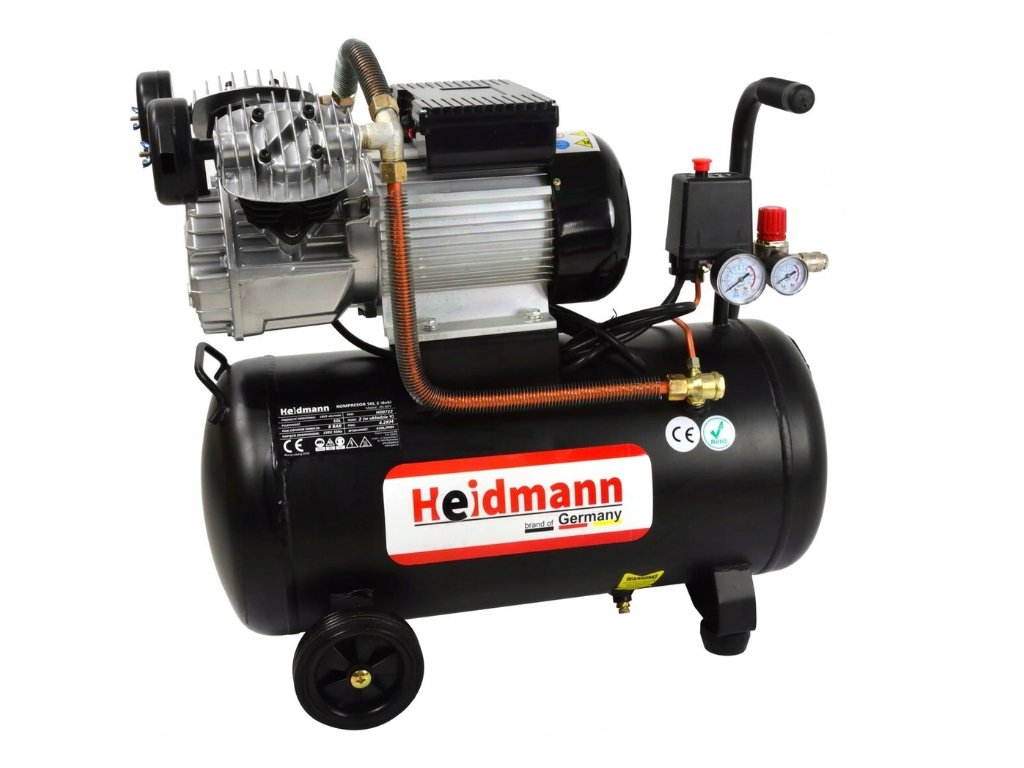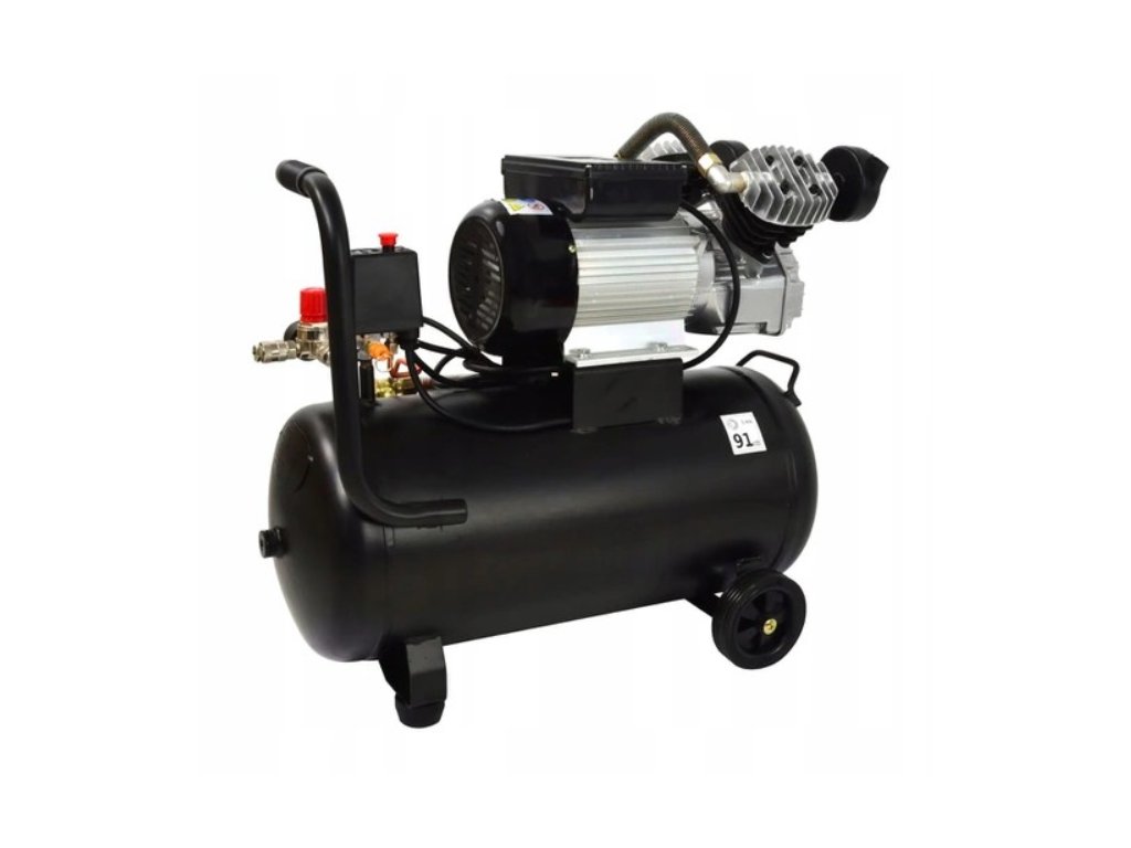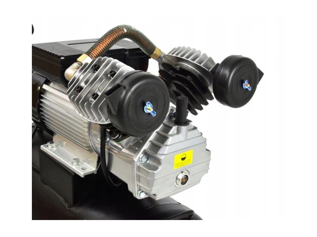 - Výkonný dvojpiestový kompresor s objemom vzduchovej nádrže 50 litrov, sacím výkonom približne 350-400 l/min a maximálnym tlakom 8-10 barov