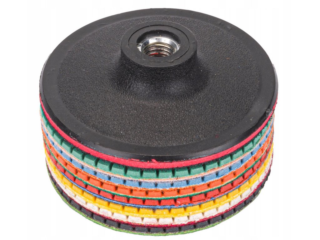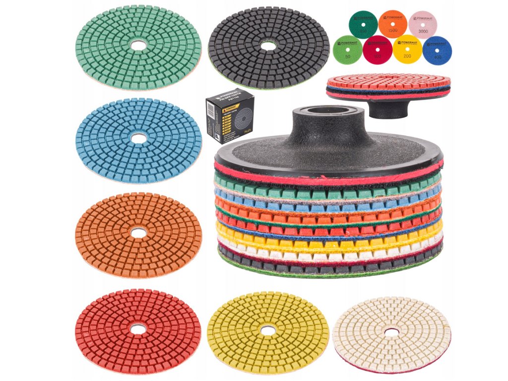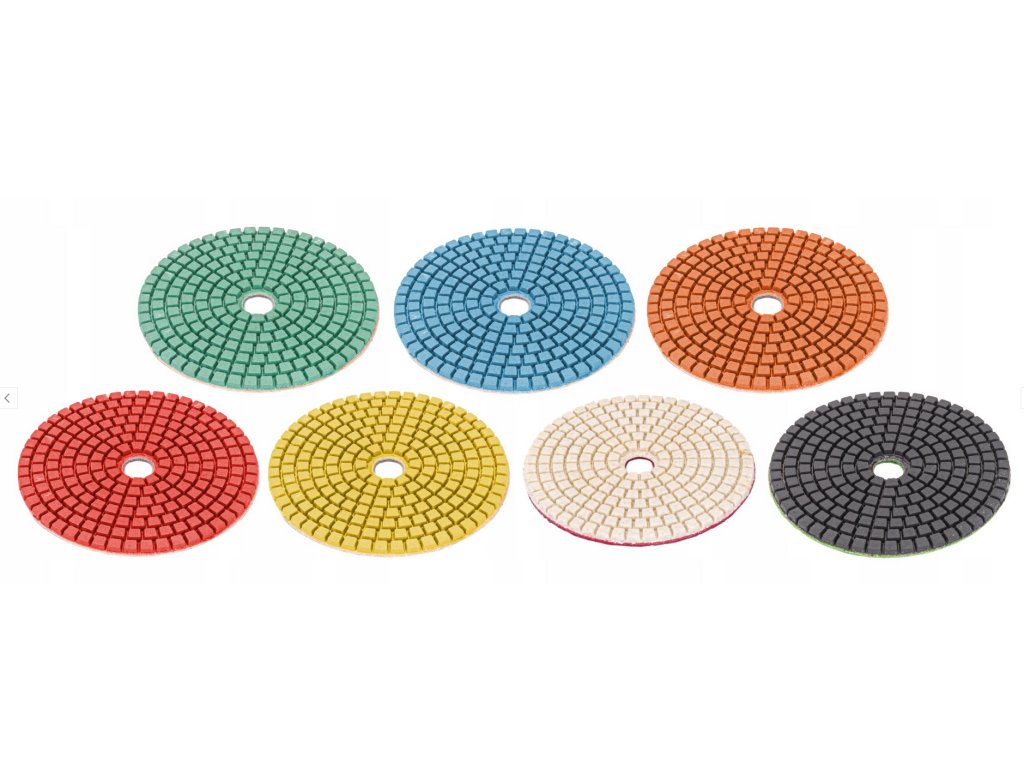 - Táto sada diamantových kotúčov je určená na mokré brúsenie a leštenie tvrdých materiálov, ako je kameň, žula, mramor, betón a keramika