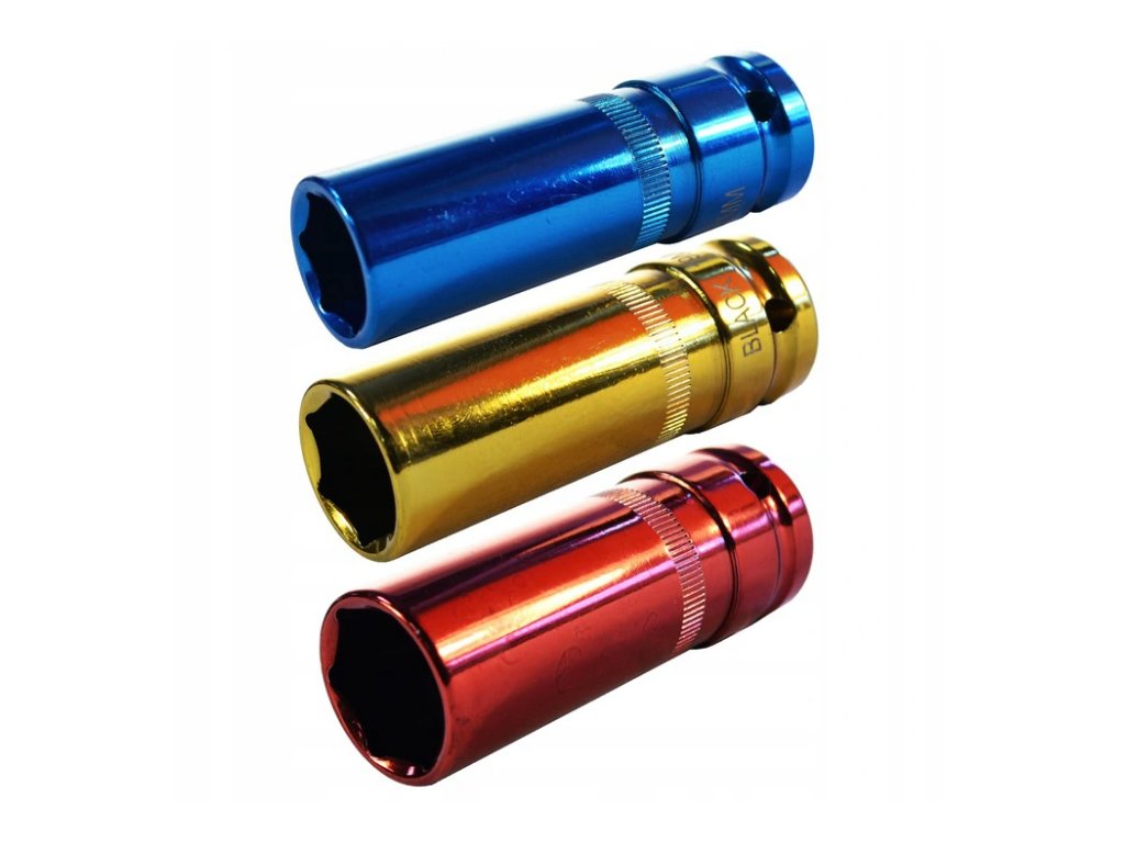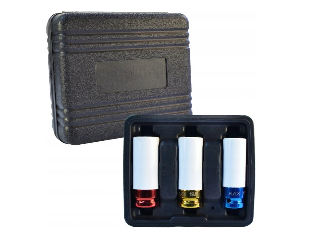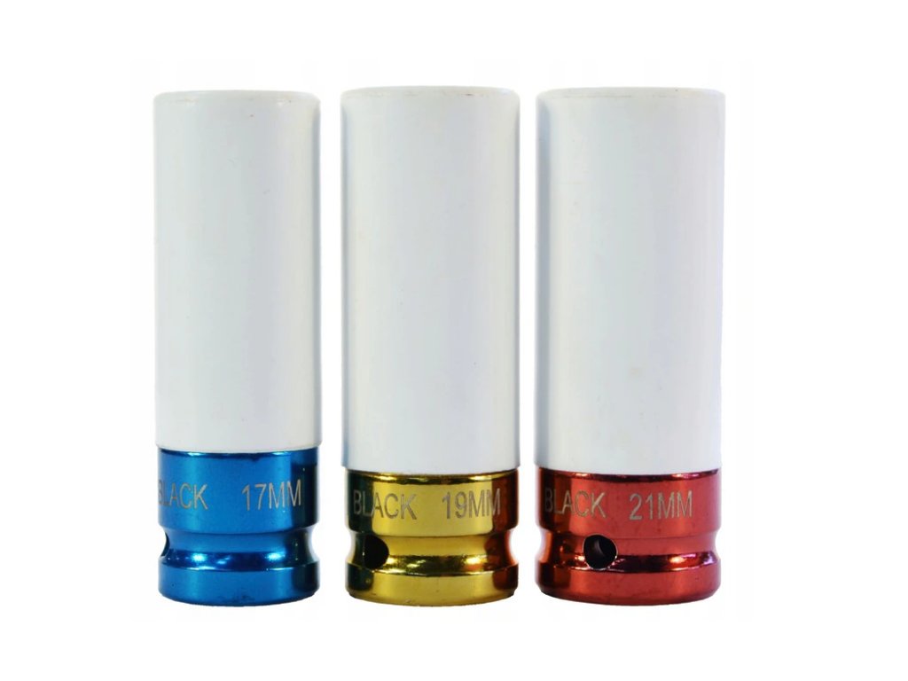 Každé viečko má plastový kryt, ktorý chráni ráfik pred poškriabaním a poškodením. Zásuvky sú vyrobené z chrómovej ocele, ktorá zaručuje vysokú odolnosť a spoľahlivosť. Rôzne farby umožňujú ľahko rozlíšiť veľkosti. Nástrčné hlavice sú určené na prácu s pneumatickými kľúčmi s pohonom 1/2". Veľkosť zásuvky: 17, 19, 21 mm Veľkosť montážneho otvoru: 1/2"