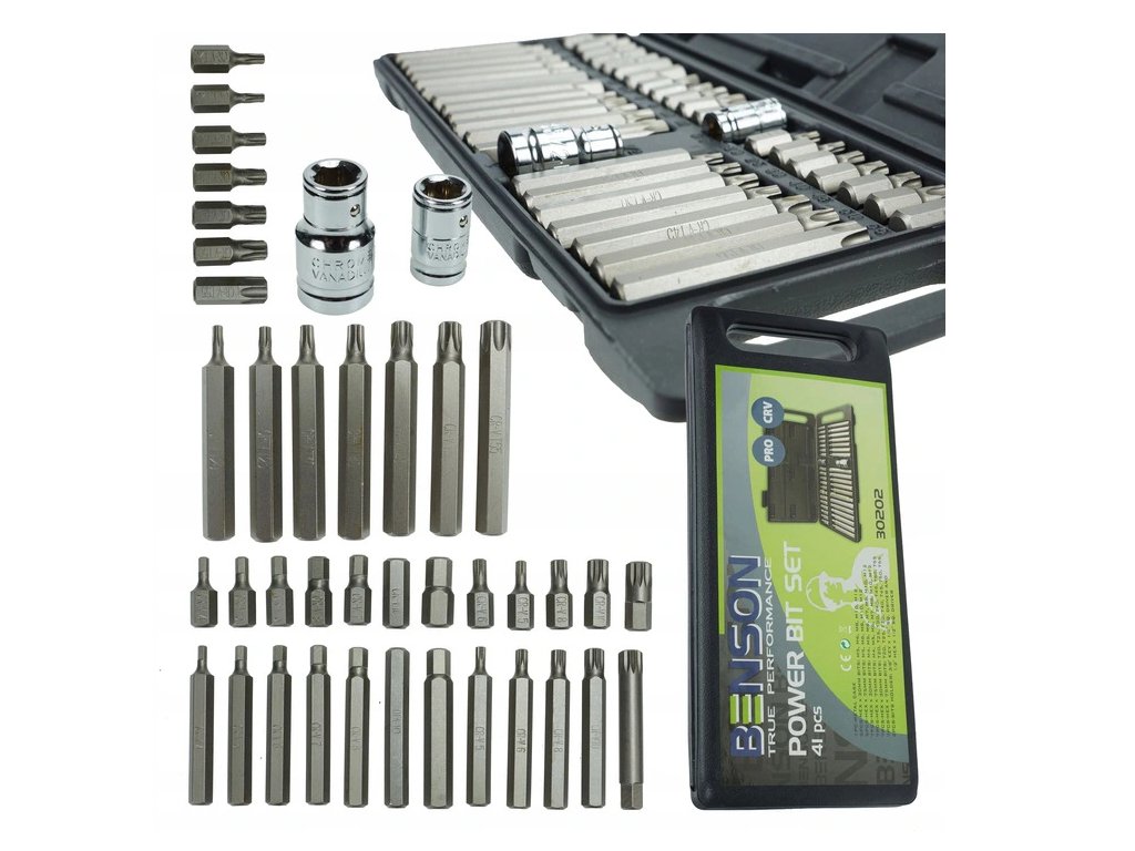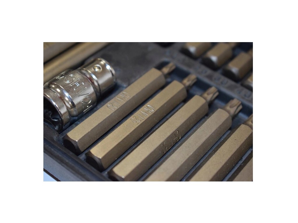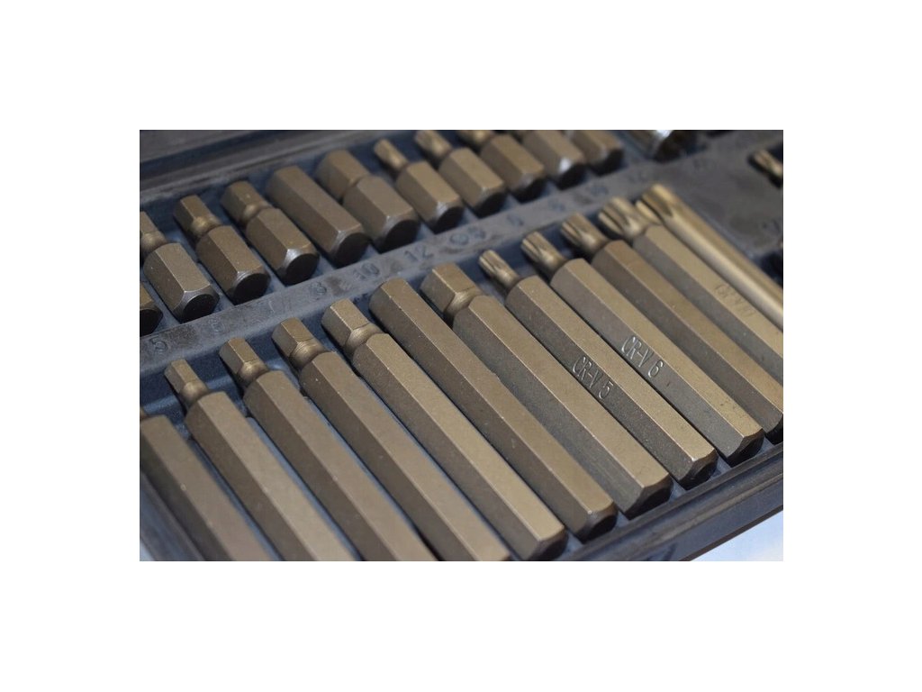- Obsahuje rôzne typy bitov, ako sú imbusové (šesťhranné), torxové a iné, ktoré sú kompatibilné s ručným aj elektrickým náradím