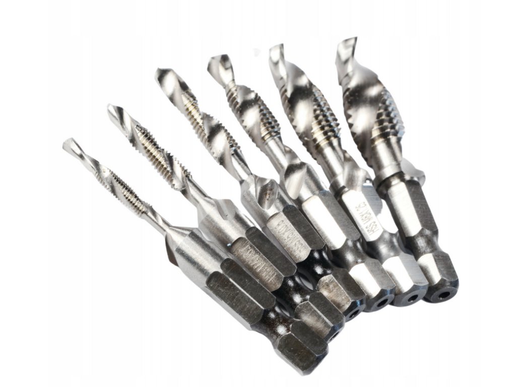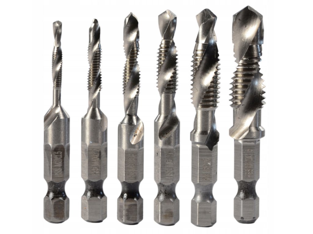 - Táto súprava obsahuje vrtáky so šesťhranným závitom vyrobené z rýchloreznej ocele (HSS), ktoré umožňujú vŕtanie, rezanie závitov a skosenie hrán v jednom kroku