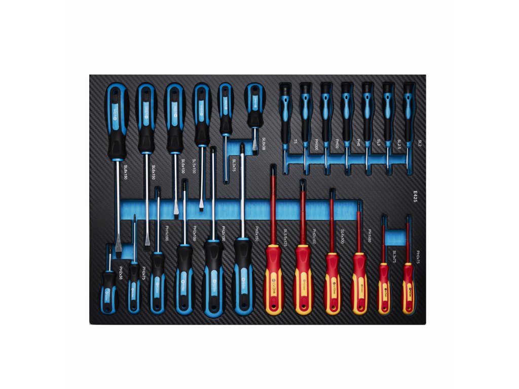 - Štvrtá zásuvka: rad skrutkovačov vrátane izolovaných a presných modelov.