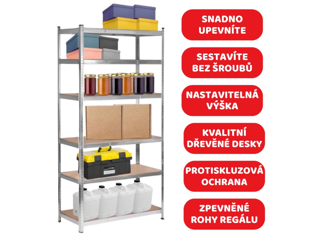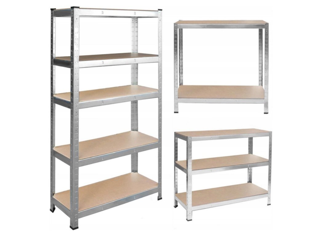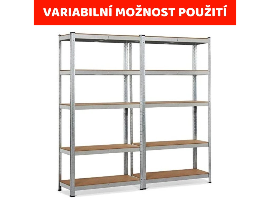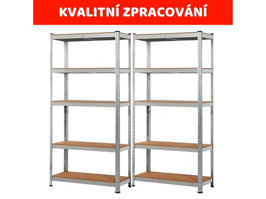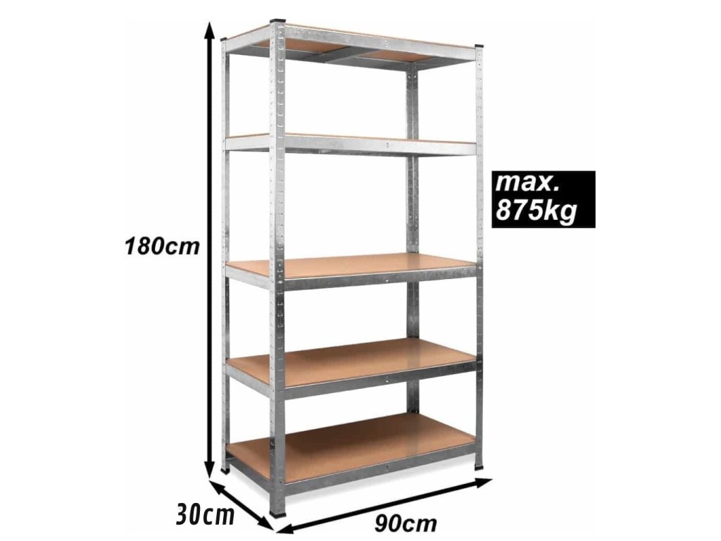 - ťažký poschodový regál s nosnosťou viac ako 175 kg na jednu policu, celková nosnosť až 875 kg, s vysokokvalitným pozinkovaným oceľovým rámom