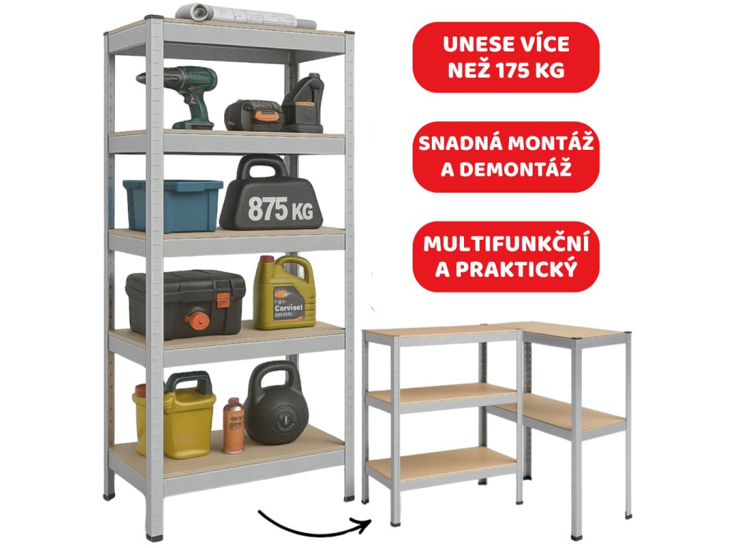 - Vybavený 5 policami - každá môže byť zaťažená až 175 kg - Celková nosnosť police je až 875 kg