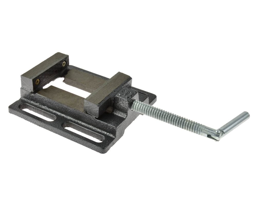 Vŕtací zverák s drážkovanou základňou, ktorá umožňuje jednoduchú montáž a polohovanie zveráka. Vyrobený z liatiny s odolnými oceľovými čeľusťami s priečnymi zárezmi.