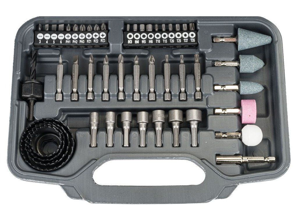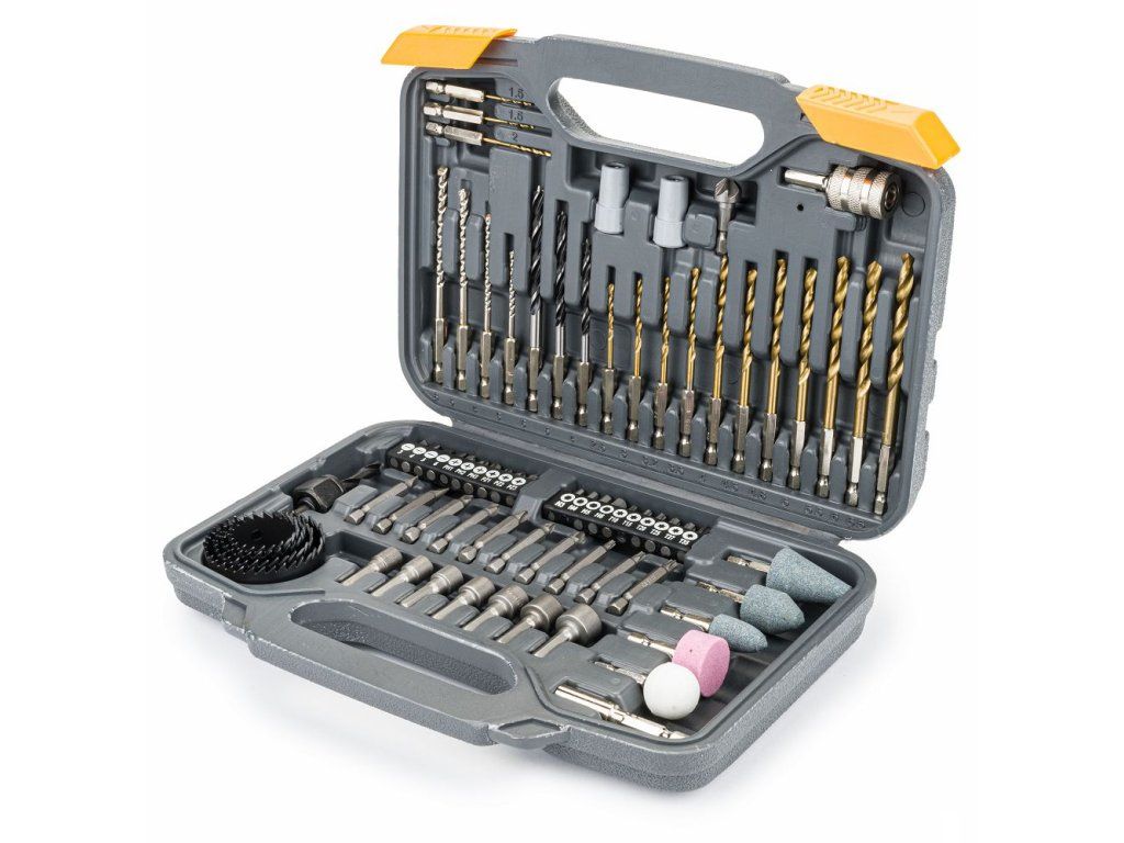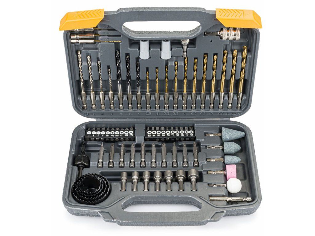 Obsahuje bity, vrtáky a nástavce pro různé materiály, což zajišťuje univerzálnost a efektivitu při práci.