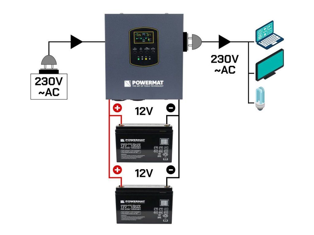 - Czas pracy UPS: Zależny od zastosowanej instalacji akumulatorowej