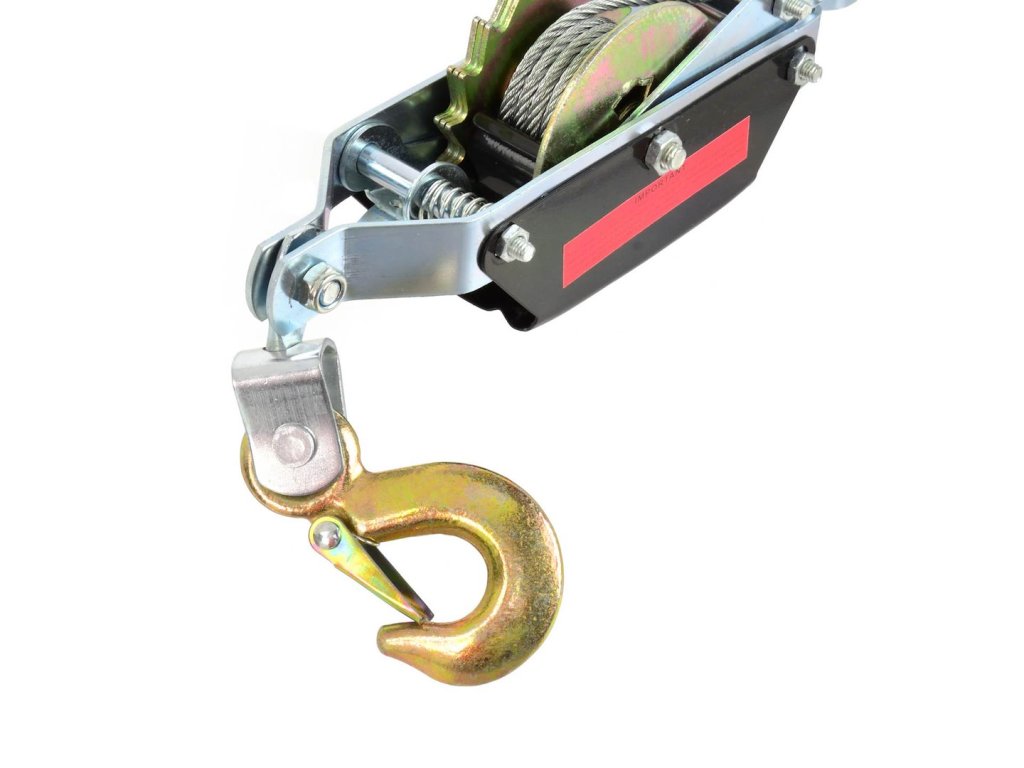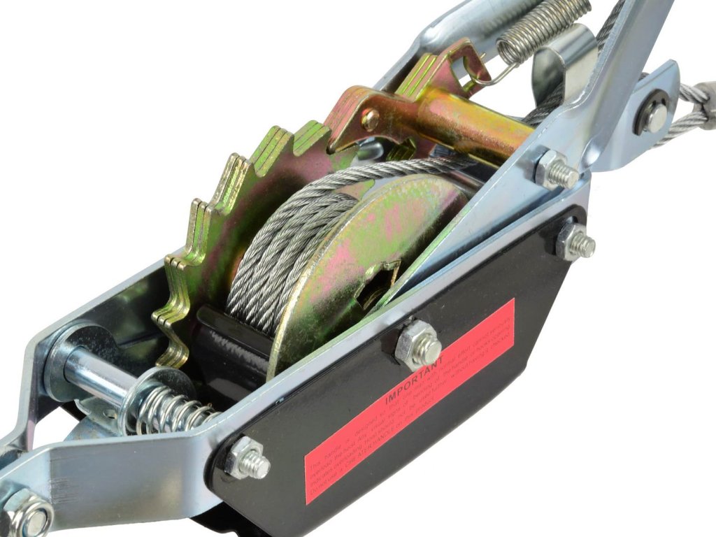 Ručný horizontálny lanový navijak. Navijak je vybavený 1-stupňovým blokovacím mechanizmom, oceľovým lanom s priemerom 4,5 mm a dĺžkou 1,8 m, ktoré v kombinácii s odolnými hákmi vytvára ťažnú silu 2000 kg.