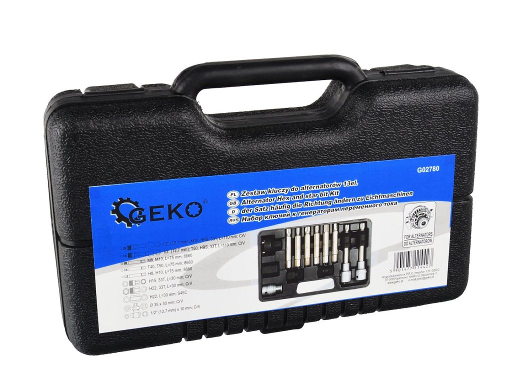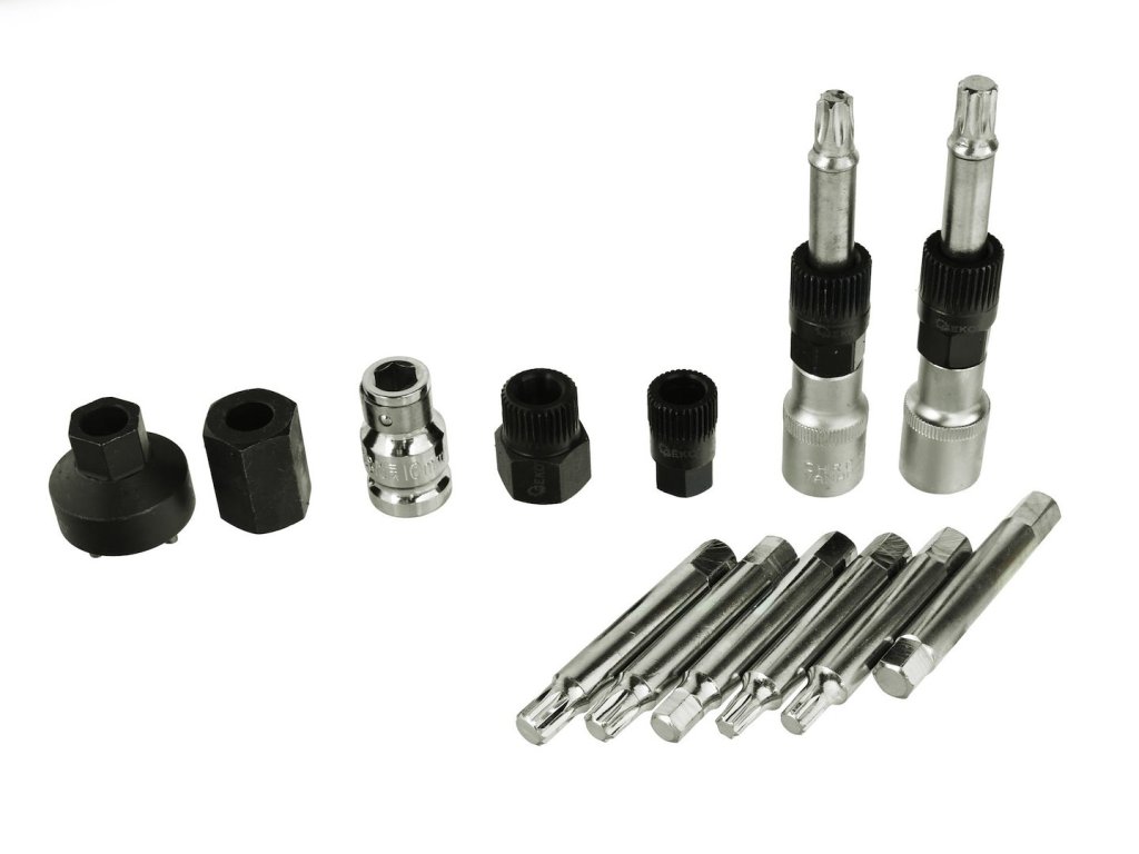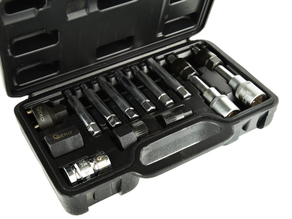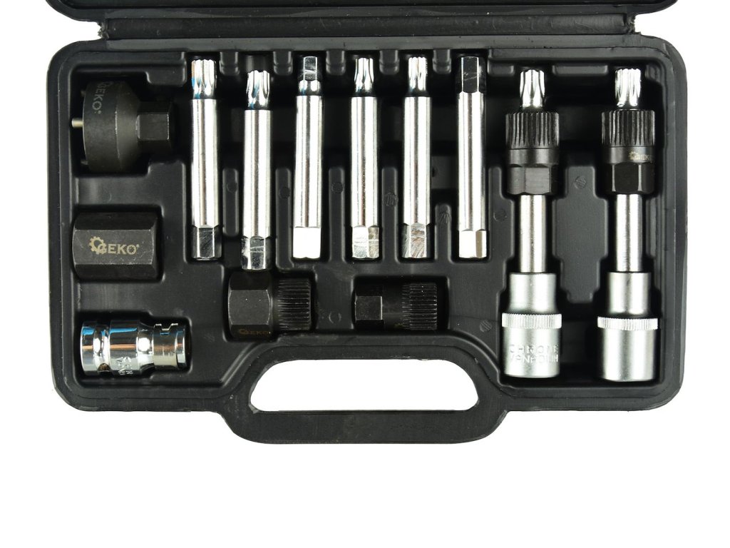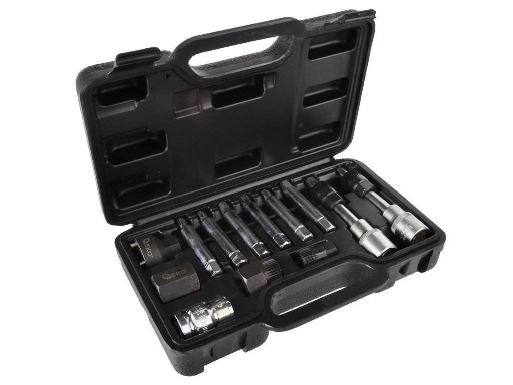Sada kľúčov na montáž a demontáž alternátorov. Kľúče sú vyrobené z vysokokvalitnej chróm-vanádiovej ocele CrV, vďaka čomu sú trvanlivé a odolné voči poškodeniu. Kľúče umožňujú súčasné odskrutkovanie skrutky upevňujúcej remenicu (vytiahnutím príslušného bitu) a pridržanie kolesa so spojkou (vytiahnutím špeciálnej objímky).