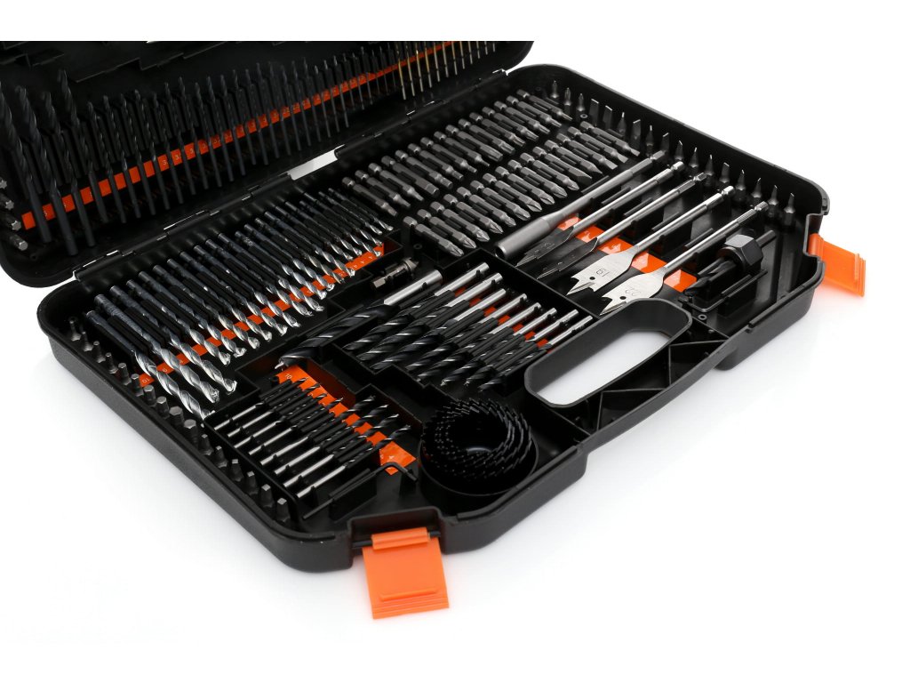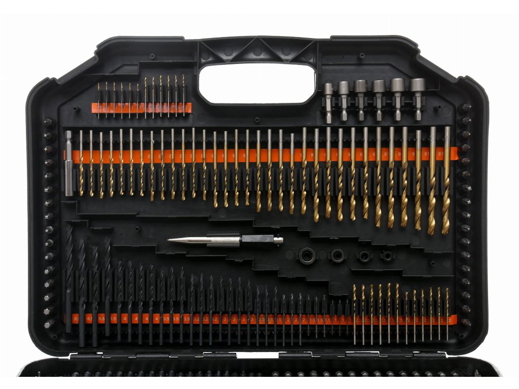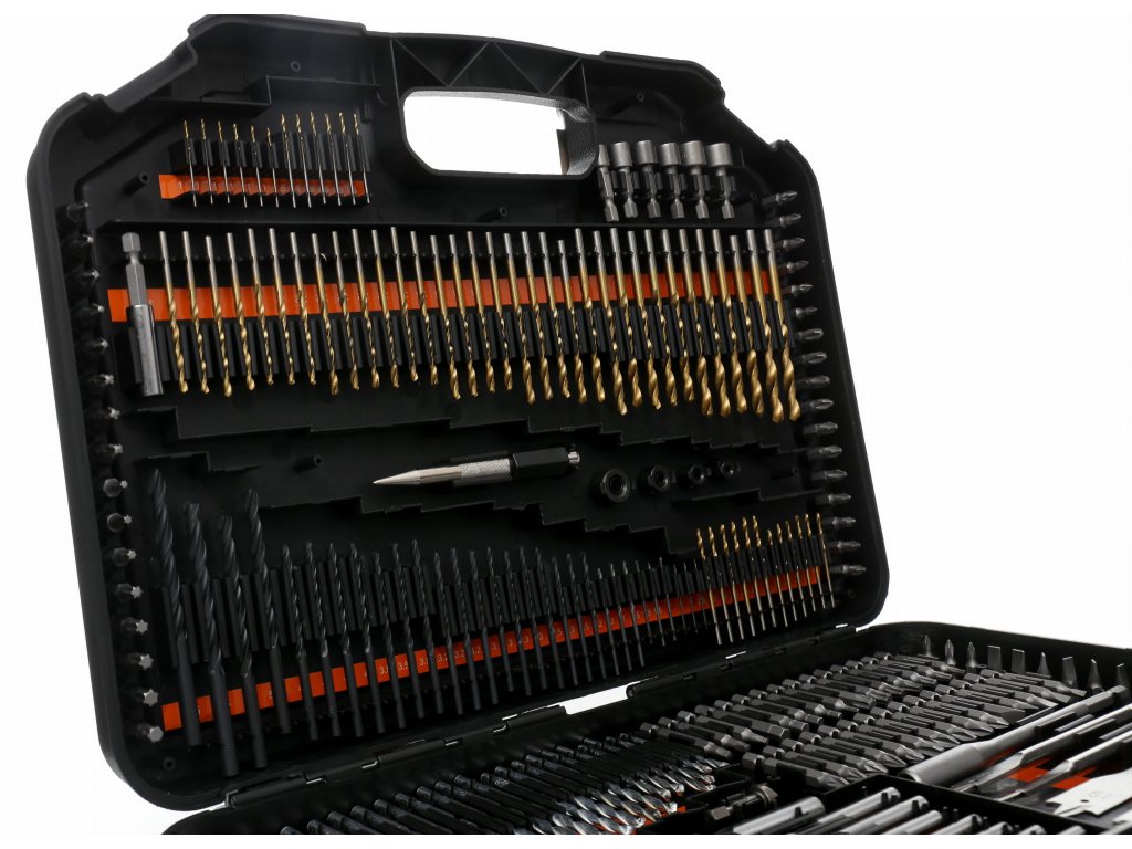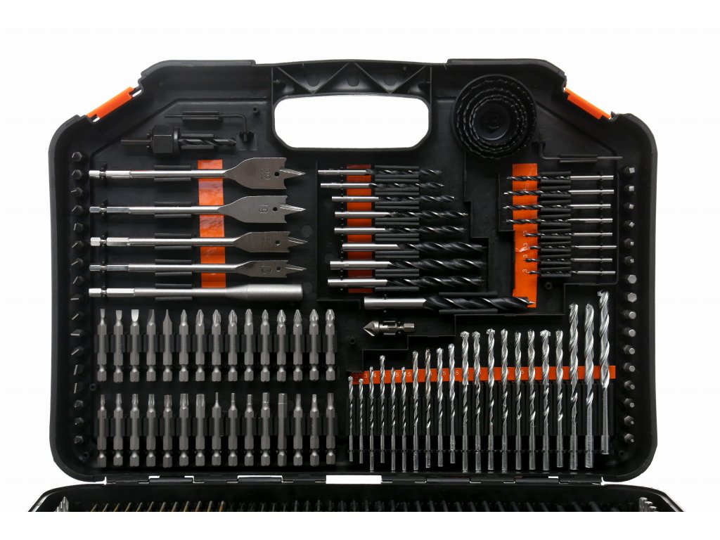 - Obsahuje vrtáky do kovu, dreva a betónu, široký sortiment vrtákov, pichliače, hĺbkové dorazy a ďalšie praktické príslušenstvo