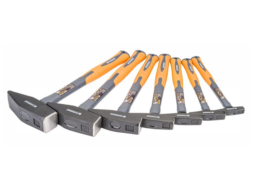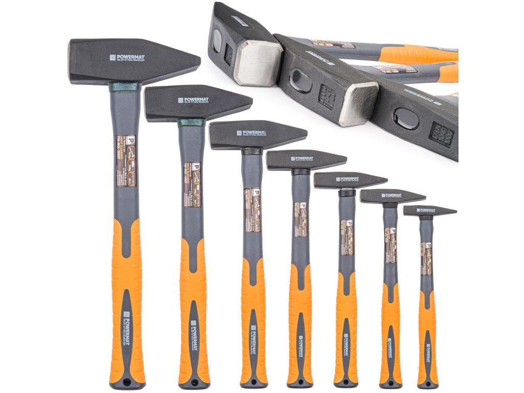 Profesionálna sada zámočníckych kladív Powermat obsahuje7 kusov v hmotnostiach od100 až 2000 g. Od jemných montážnych prác až po ťažké údery máte vždy po ruke ideálne náradie. Odolné rukoväte zo sklených vlákien a pogumované rukoväte zaručujú pohodlie aj pri dlhodobej práci.