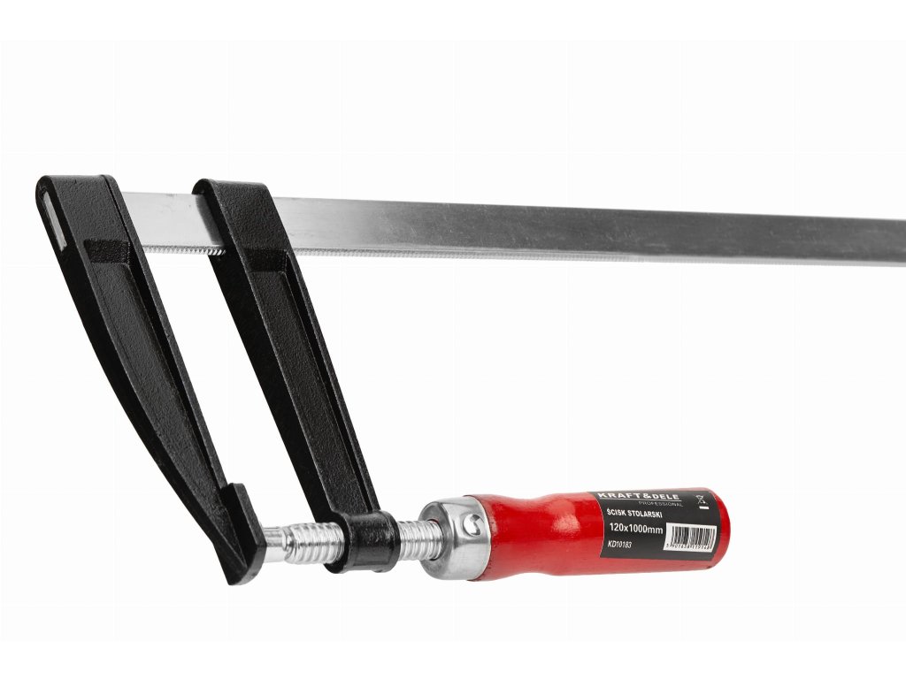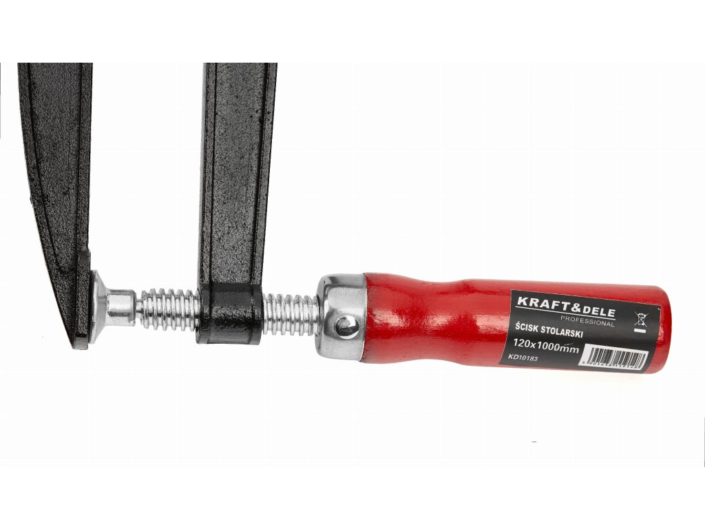 Robustný tesárska svorka Kraft & Dele KD10183 s upínacou dĺžkou1000 mm a hĺbka čeľustí120 mm je ideálny na lepenie dosiek, lepenie rámov, montáž nábytku a iné stolárske a tesárske práce.Oceľové vodítko amäkké prídavné zariadenia na čeľustiach zabezpečujú vysoký upínací tlak a zároveň chránia materiál pred poškodením.