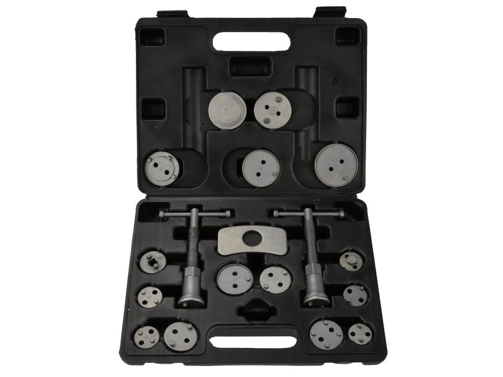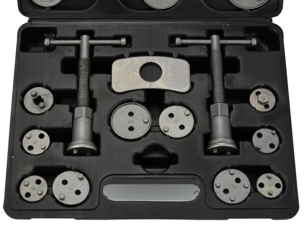Profesionálna 18-dielna súprava na vyťahovanie/lisovanie brzdových piestikov, nevyhnutná na opravu vozidiel vybavených kotúčovými brzdami.