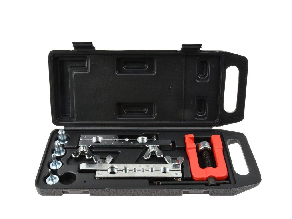 Súprava na spracovanie brzdových a palivových hadíc. Vhodná na rezanie a rozširovanie medených, mosadzných a hliníkových rúrok a hadíc s hrúbkou steny do 1 mm.