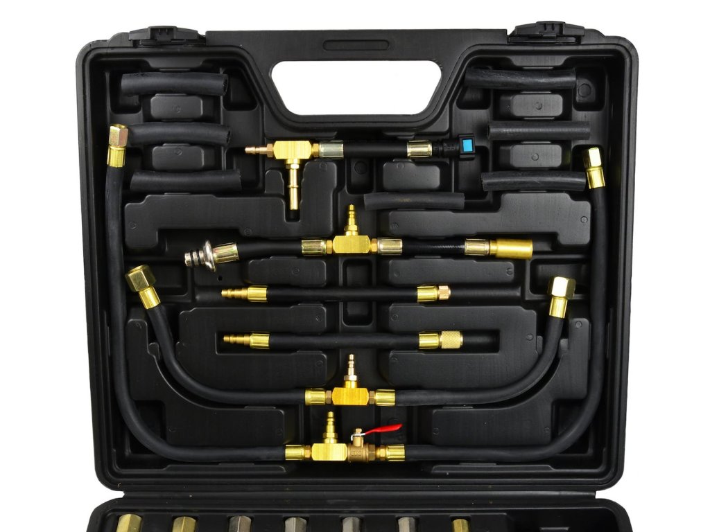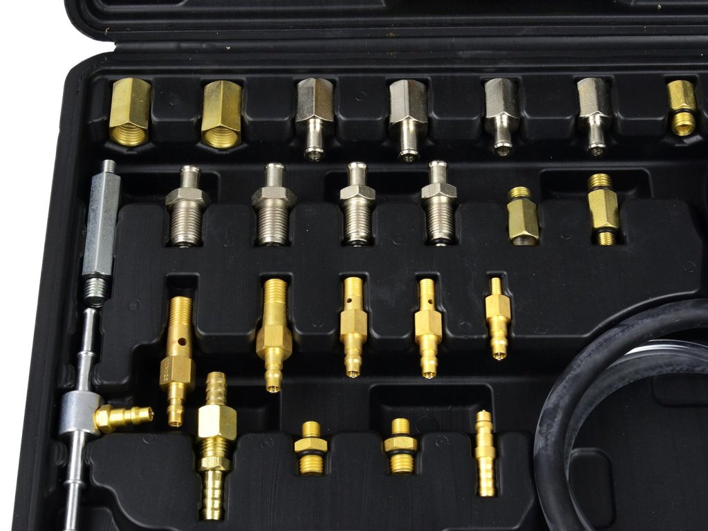 Multifunkčná súprava na meranie tlaku pri spaľovaní benzínu. Súprava je kompatibilná s väčšinou japonských, amerických a európskych značiek. Súprava obsahuje adaptéry a príslušenstvo vhodné pre väčšinu systémov vstrekovania paliva. Manometer s dvojitou stupnicou: 0-140 psi..