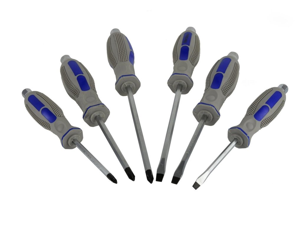 Súprava šiestich skrutkovačov pre inštalatérov z chróm-vanádiovej ocele (CrV). Telo skrutkovača prechádza celou rukoväťou a je zakončené kovovou hlavou so šesťhrannou rukoväťou , takže sa dá podložiť kľúčom a je ideálny na prácu s kladivom.